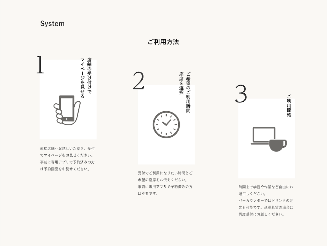 ③どうやって利用するのか(システム)を上部にまとめました - 上記を受け、「カフェメニュー」の情報自体は優先度が低いと考え、写真は1枚にまとめて順番を他のセクションよりも位置を下げました