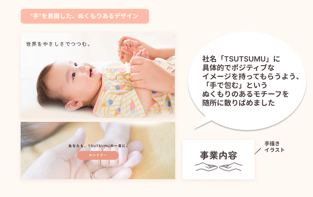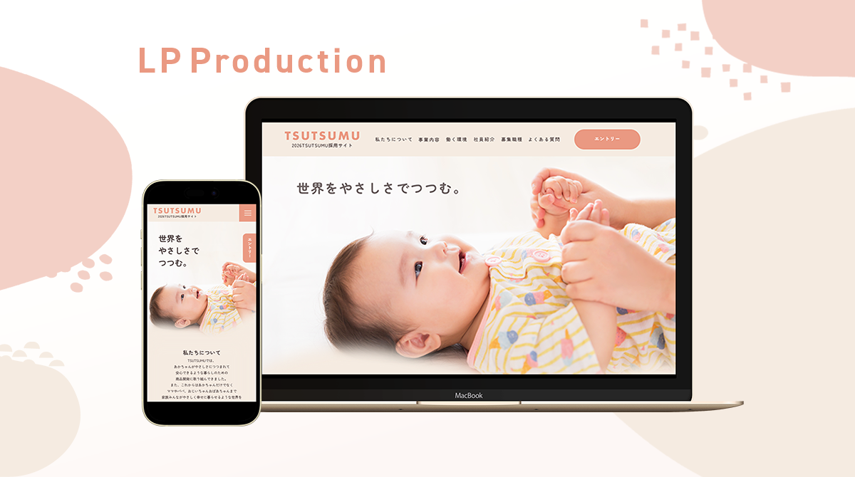 「『世界をやさしさでつつむ。』というフレーズに共感し、家族や人とのつながりを大切にできる人が安心して応募できる採用サイト」をコンセプトに、安心感ややさしさを感じるトンマナで制作を行いました。