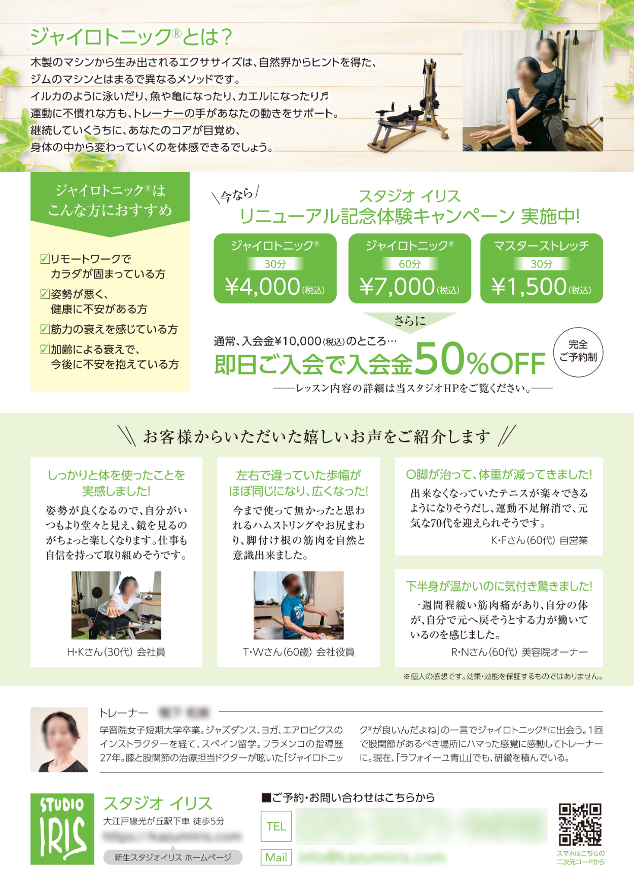 スタジオ イリス リニューアルオープンチラシ・HPヘッダー nakart デザイナー OVERVIEW リニューアルオープンに伴い、チラシとホームページヘッダー制作のご依頼をいただきました。 YEAR 2021 【HPヘッダー】【チラシ】