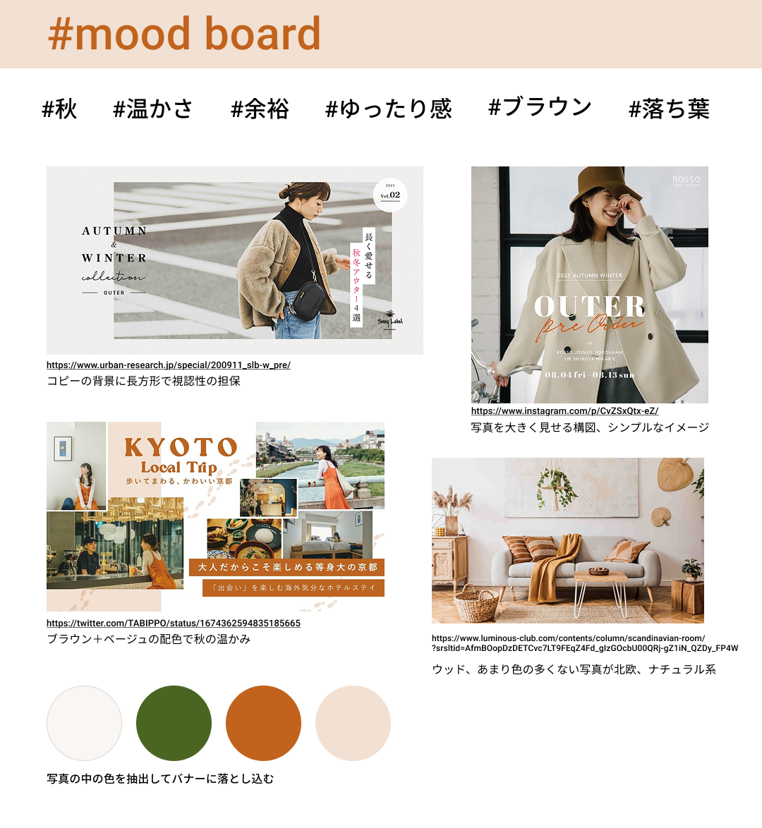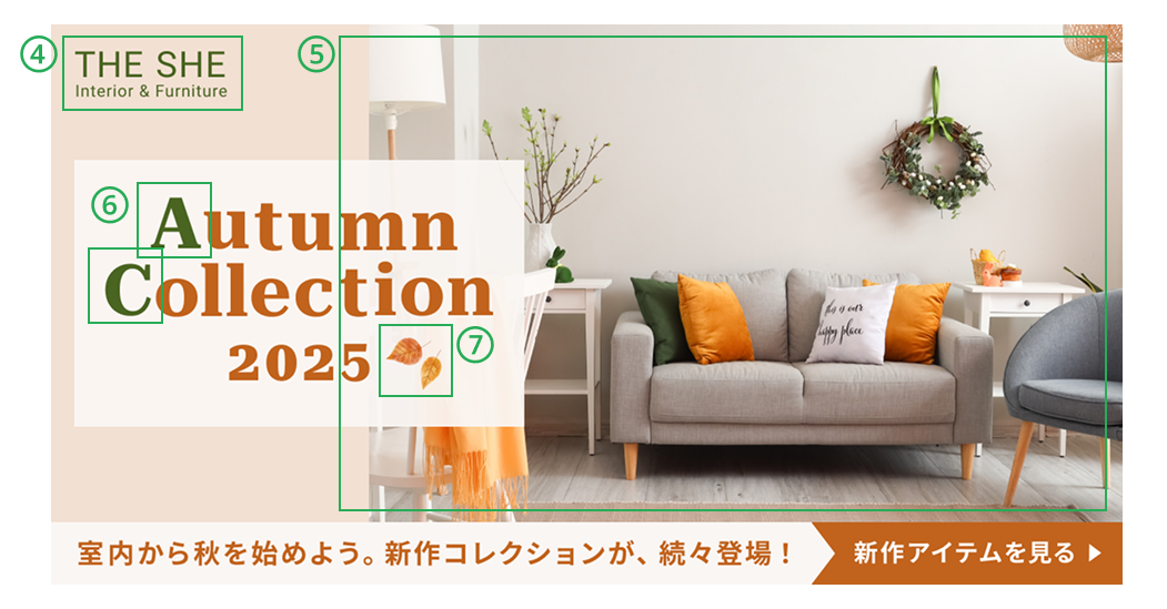 ⑤北欧系インテリアを感じられるよう、色数が多くなく家具の一部や床に木を感じられることを選択。画像からも秋を感じられるようなものを意識した。写真に使われている色(クッション、フローリングの色)や、そこから派生した色を使うことで、バナー全体にまとまりが出るよう考慮した。