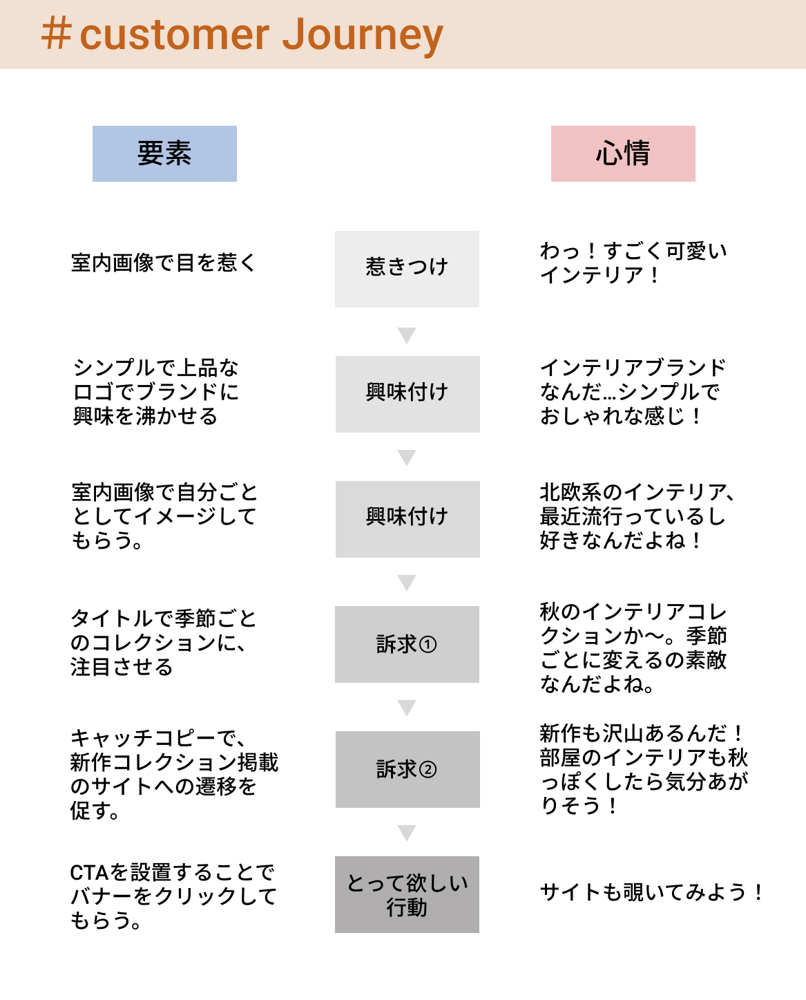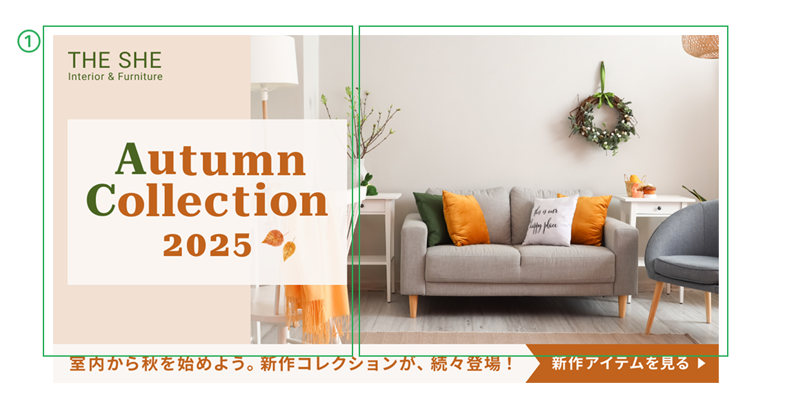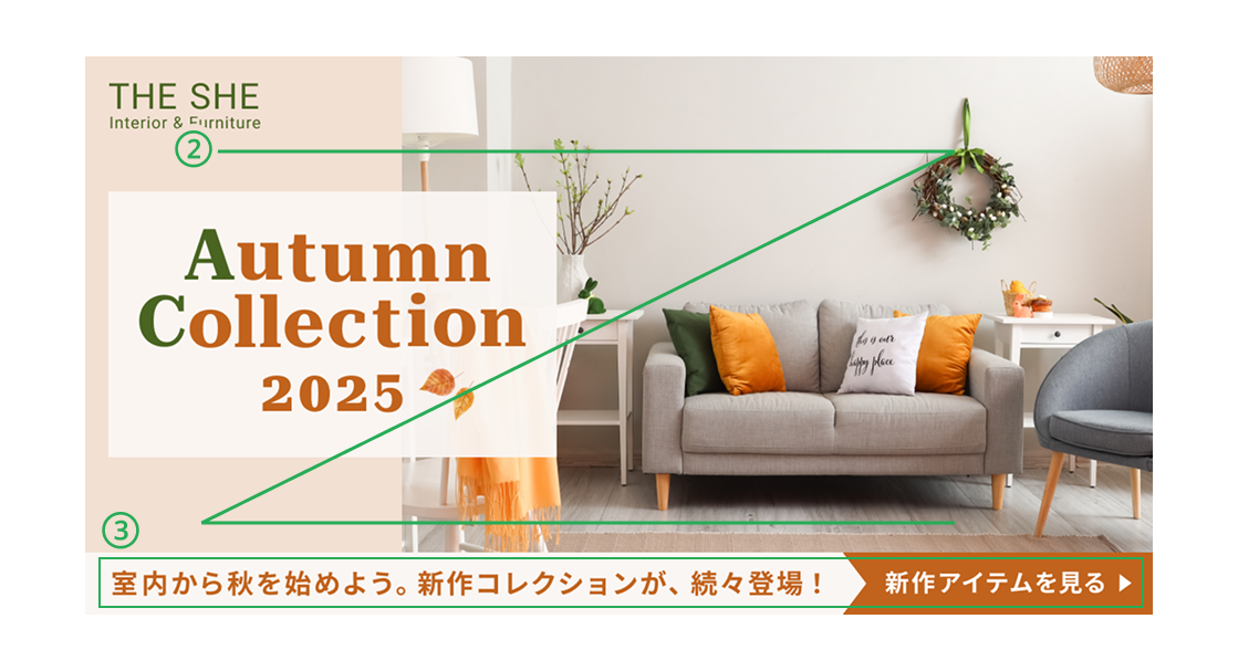 ①インテリアブランドのバナーのため、見た瞬間にインテリアに目がいくよう写真メインの構成にしました。横長サイズを活かし、横二分割のレイアウトにすることでユーザーの目線を迷わせないことに配慮しました。