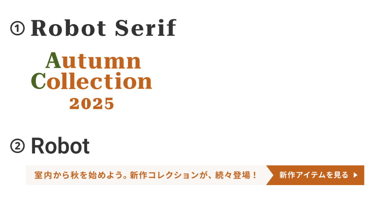 ②キャッチコピーとCTAには、情報の伝わりやすさを最優先に考えゴシック体を使用。タイトルと同じRobotを使うことで、全体的な統一感も考慮している。