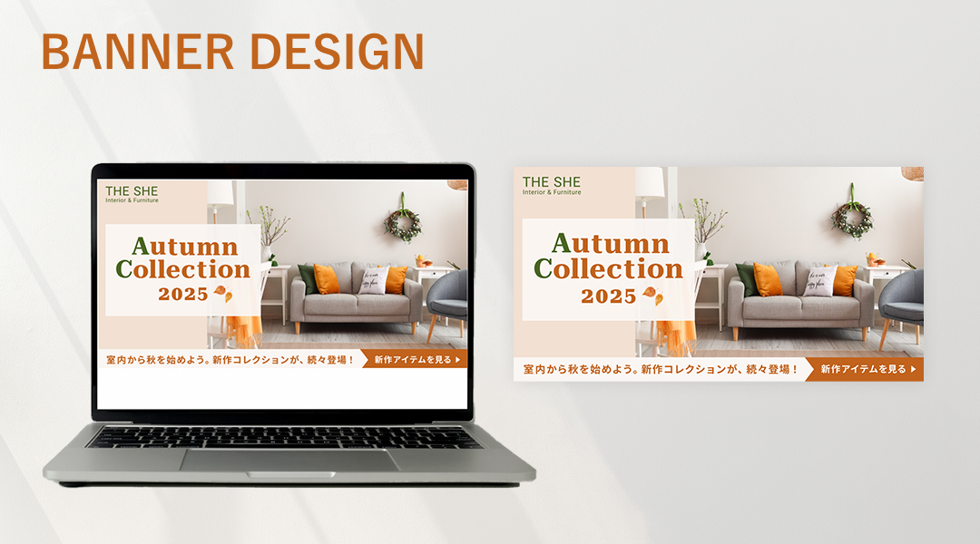 【スクール内コミュニティ課題で、架空の北欧系インテリアブランドの認知拡大と、秋の新作コレクションの購買意欲喚起を目的としたバナー制作をしました/制作年月:2025年9月/制作期間:1週間/制作時間:28時間/使用ツール:Figma、Photoshop】