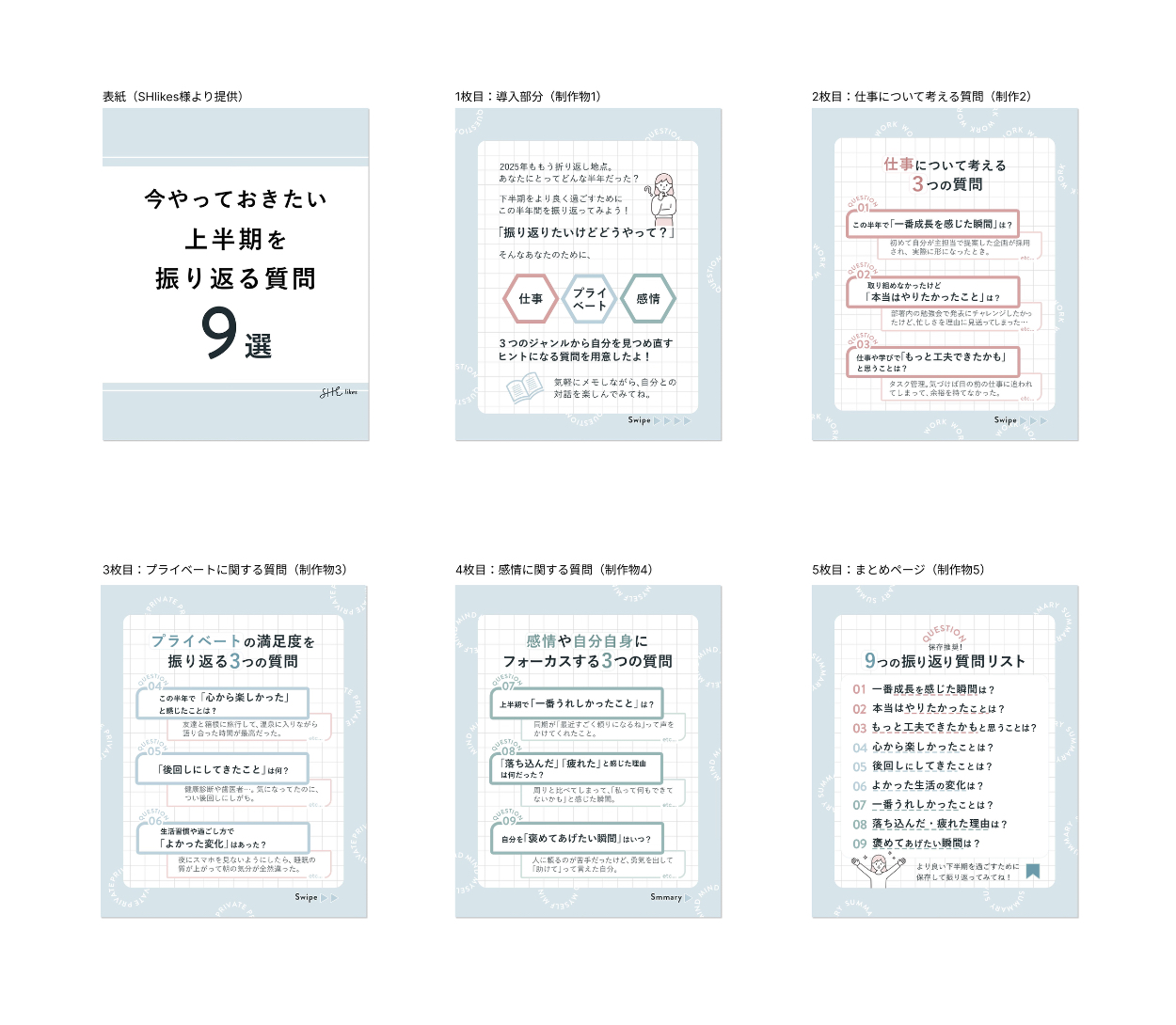 振り返り9選ということで、テンポよく読み進めてもらうために1枚目は導入部分として共感を誘いつつ問題提起、2〜4枚目で仕事、プライベート、感情の3つをテーマに3つずつの質問を用意しました。最後にまとめページと保存促しで、ターゲットがほんの少しでもアクションしたくなるような構成を意識して制作しました。