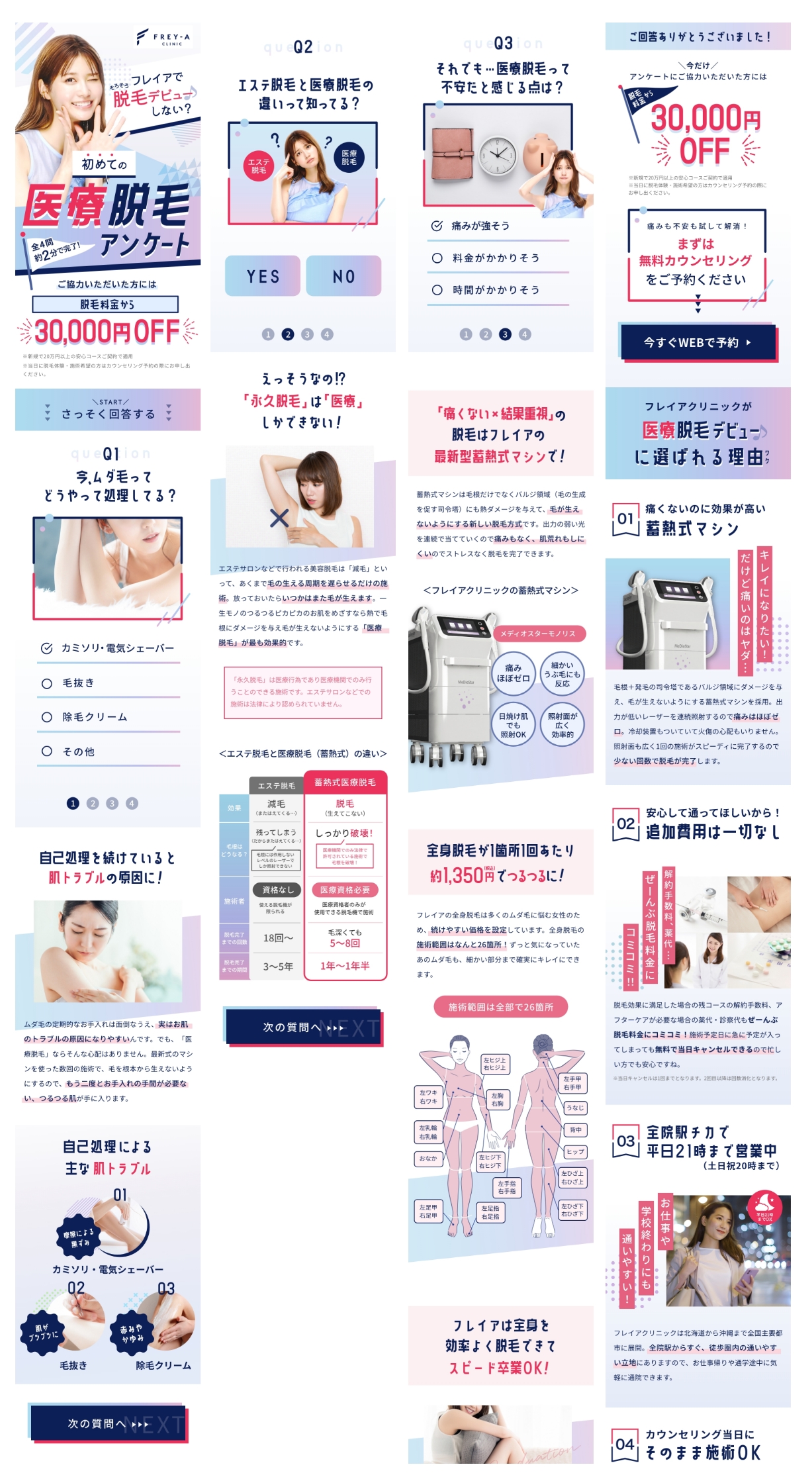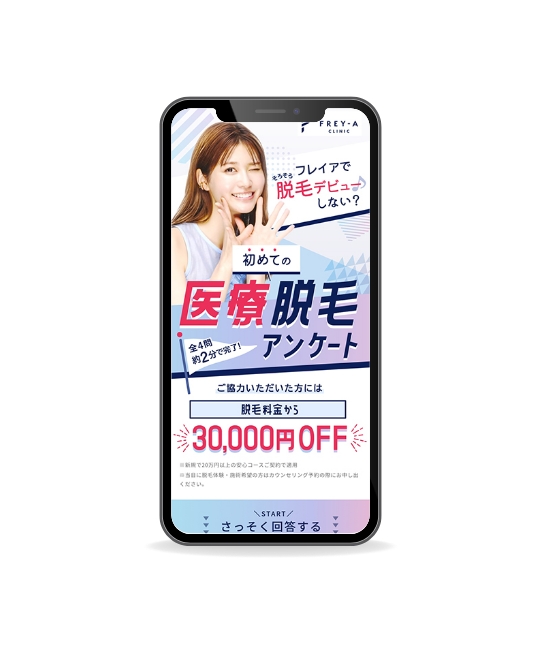 医療脱毛初心者をターゲットに、気軽にアンケートに答えてもらえるようPOPでカジュアルな雰囲気に仕上げました。ターゲット層が10代後半〜ということもあり、カラフルでTikTokを意識したようなカラーやPOPなフォントを使用しています。