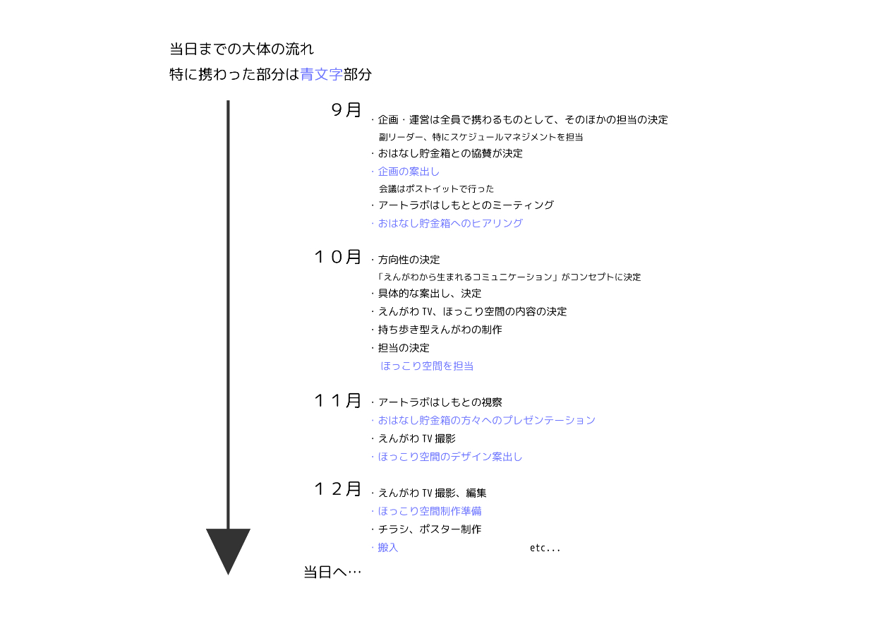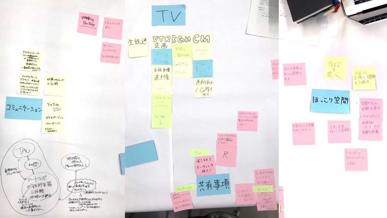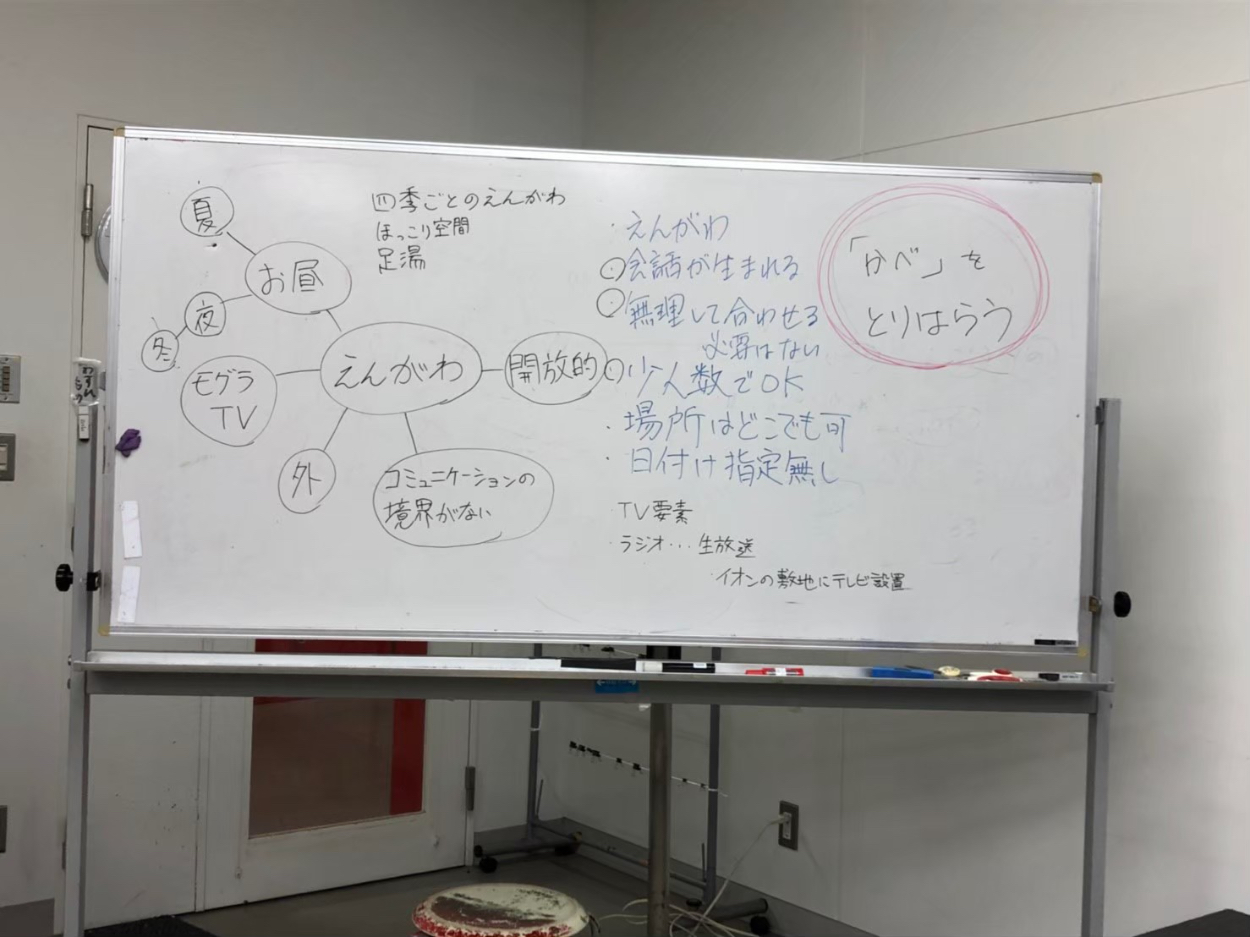 企画の案出しの時点では、企画が多くの人々に届くよう、イベント当日の配信やSNSでの広報活動も案に出ていたが、「地域の人々のつながりを丁寧につくること」が大事という判断になり、ターゲットをアートラボ周辺の住民の方々に絞った。