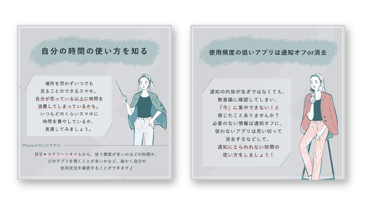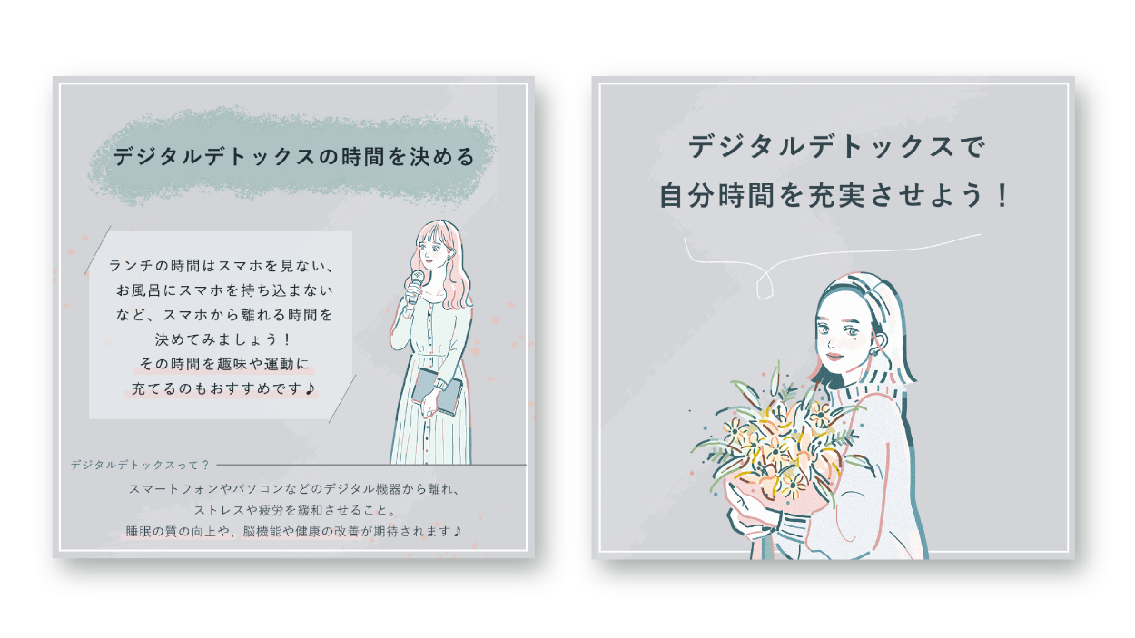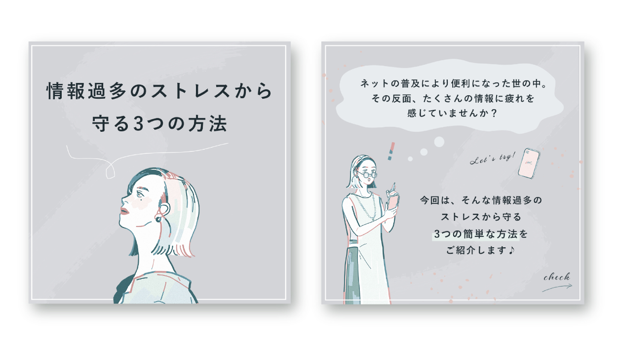 【バナー制作】SHElikes様 ななか designer/marketer OVERVIEW Instagram・Twitter用バナー制作 YEAR 2021 【ポイント】コンテンツ内容のご提案→デザイン作成→公式Instagram・Twitterへの掲載に採用いただきました。ネットの普及により世の中が便利になった反面、多くの情報にストレスを抱えている方も多いのではと思い、このテーマを選定いたしました。特に20~30代の女性は情報収集や流行りに敏感で、気軽に息抜きをしたいと感じている人も多いと思います。気分転換の一つとして参考にしていただきたく作成いたしました。