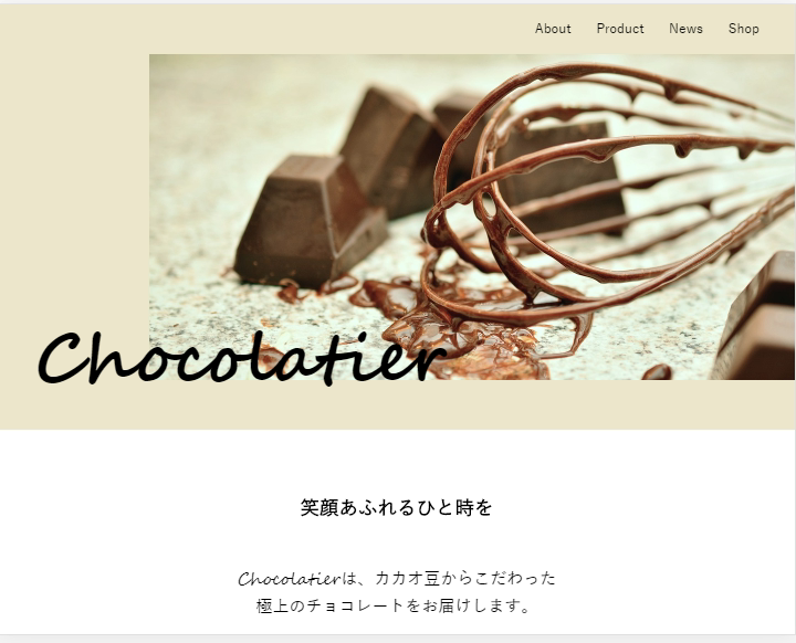Chocolatier 神川 真澄 webデザイナー志望者 OVERVIEW チョコレート店の架空サイトです。 チョコレート店の架空サイトです。シンプルで上品なサイトにしました。チョコレートのとろけるような流れるイメージを彷彿させるように、ロゴを筆記体にしてみました。