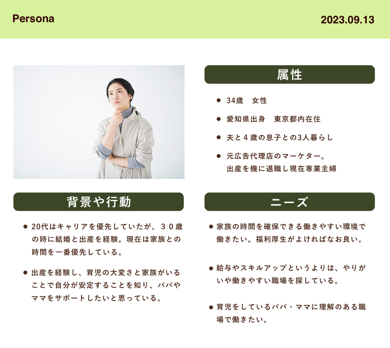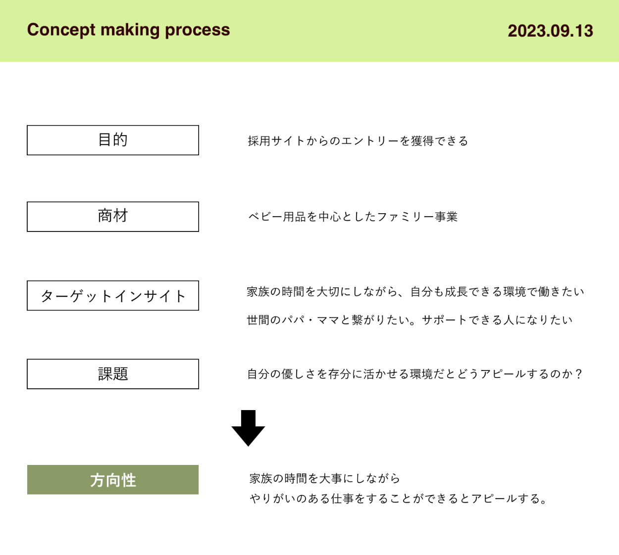 その結果、「家族などの身の回りの人を大切に温かい想いを持っている人」がTSUTSUMUのカルチャーに合う人ではないかと言語化し、コンセプトとメインペルソナを設定しました。