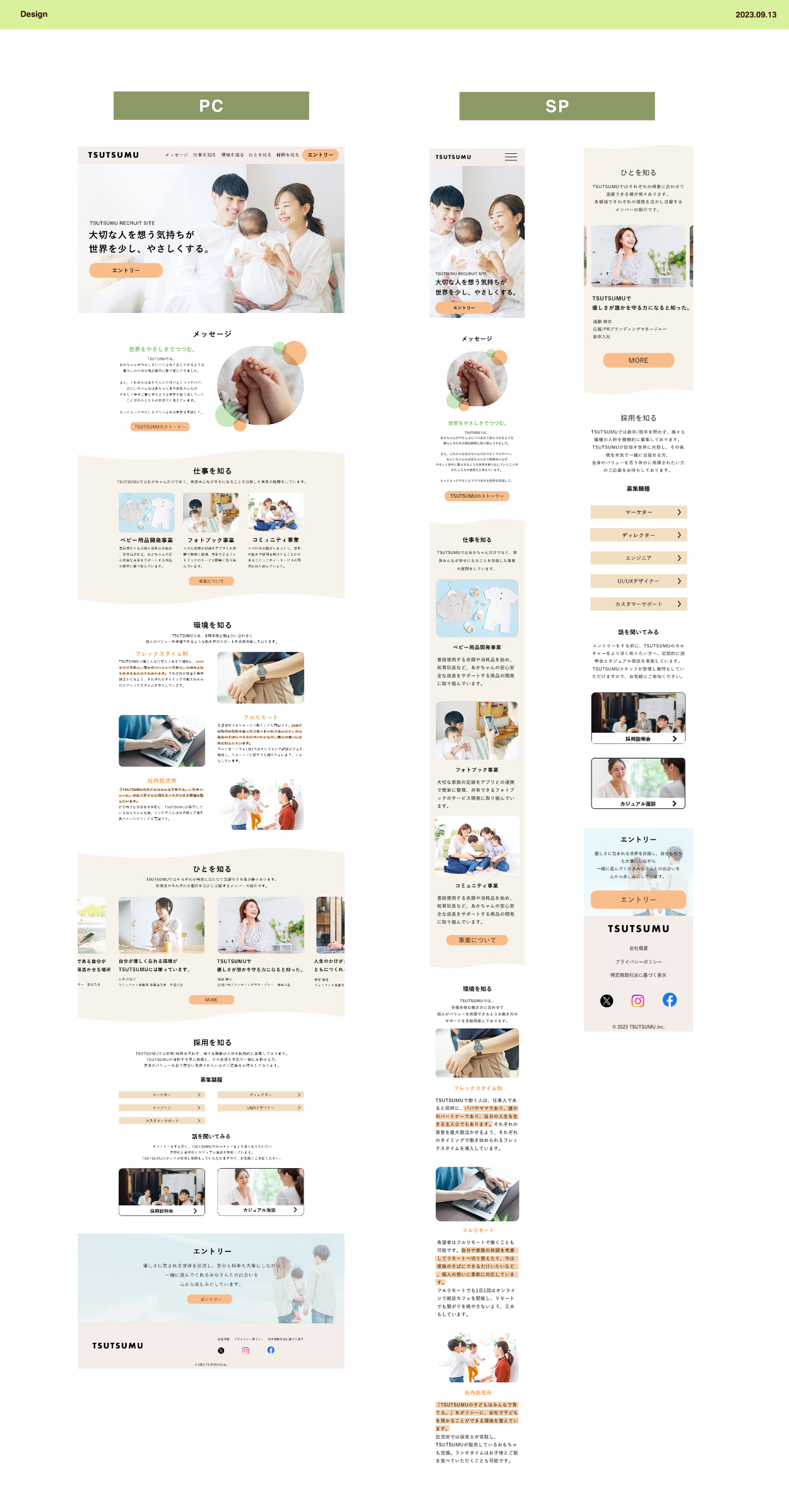 コンセプトやメインペルソナと検討したところ、TSUTSUMUのカルチャーを体現しているのは「働き方」の部分ではないか?と推測し、パパやママでも働きやすい環境であることをアピールできるデザインを設計しました。