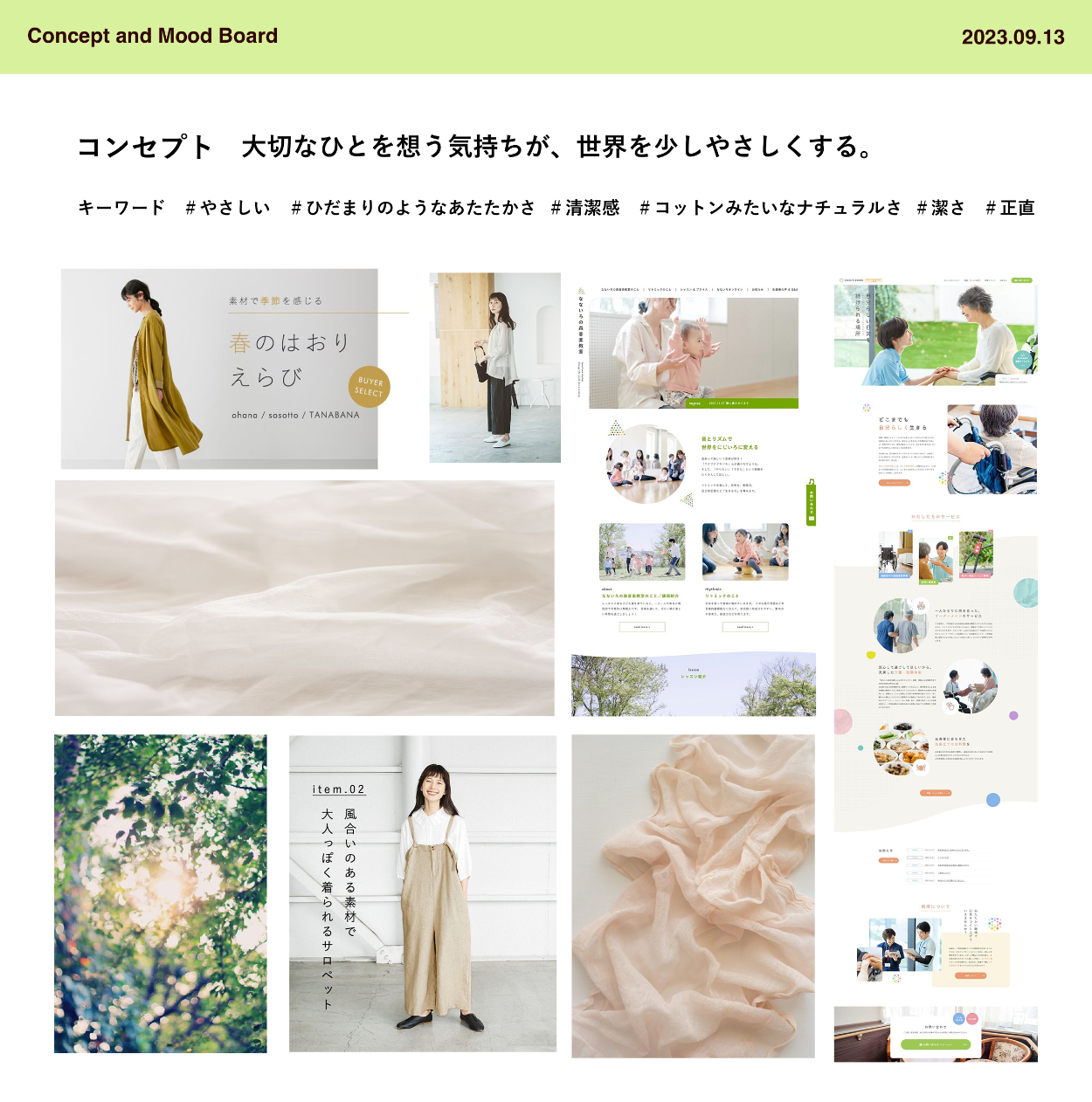 コンセプトとペルソナを元に、サイトの軸となるコピーライトとムードボードを作成し、サイト全体の世界観と構築していきました。コンセプトをもとに、ユーザーストーリーやスタイルガイドを作成したのち、サイト制作に臨みました。