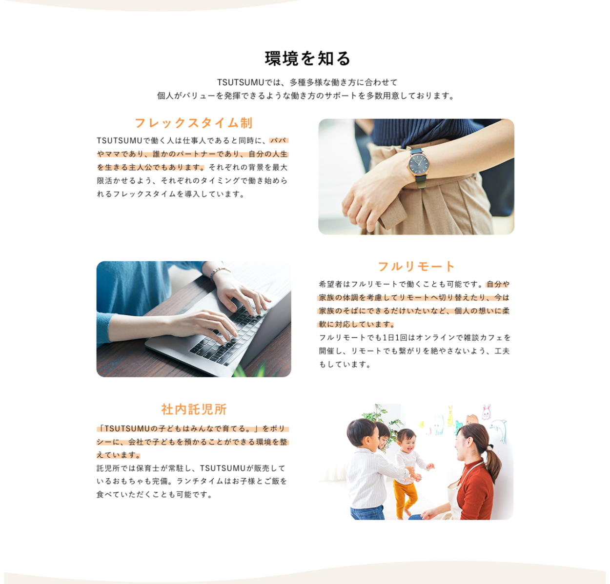 また、働きやすい制度が導入されているだけで実際には使われていないように見えることを考え、TSUTSUMUが働き方を導入している背景やポリシーを丁寧に記載しました。