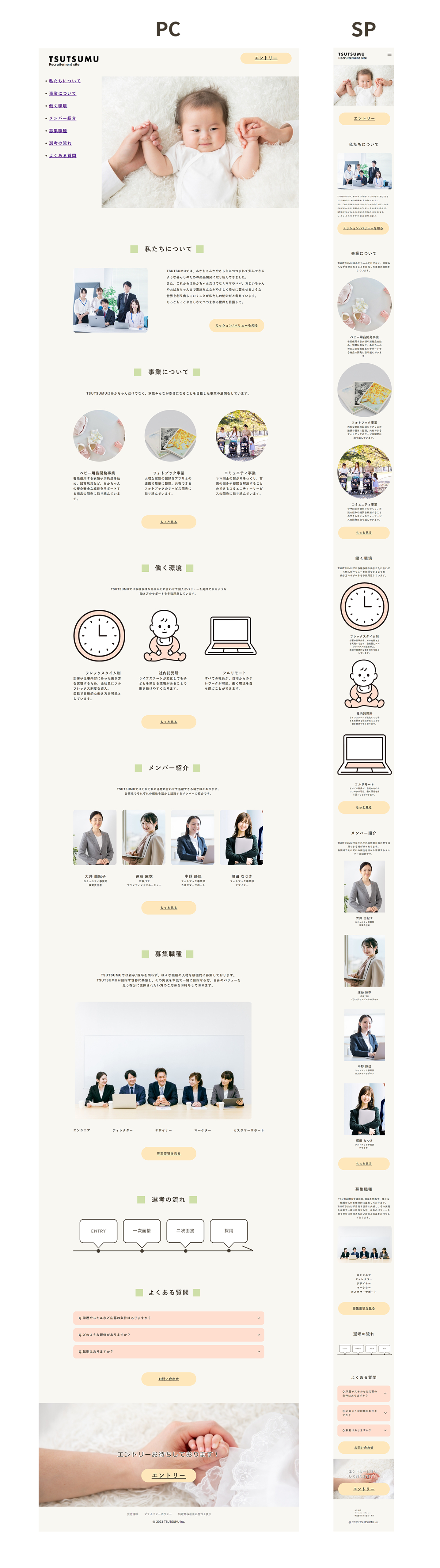 報酬面よりもTSUTSUMUが作っていきたい世界に強く共感してくださる方がターゲットとのことでしたので、まず最初に会社理念を置きました。またカルチャーフィットする方もターゲットとのことでしたので、その後に事業内容と働く環境、メンバー紹介を置きました。最後に募集職種と採用の流れ、よくある質問を置くことでエントリーへの導線を作りました。