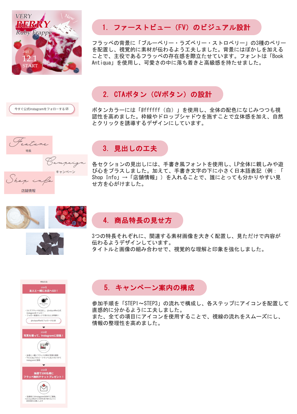 メインターゲットは「20〜30代の女性」で、Instagramを日常的に利用する“トレンド感度の高い層”を想定しています。そのため、「写真映えする構成」「SNS投稿を促すビジュアル設計」「手順がひと目で分かるキャンペーン導線」を意識して制作しました。