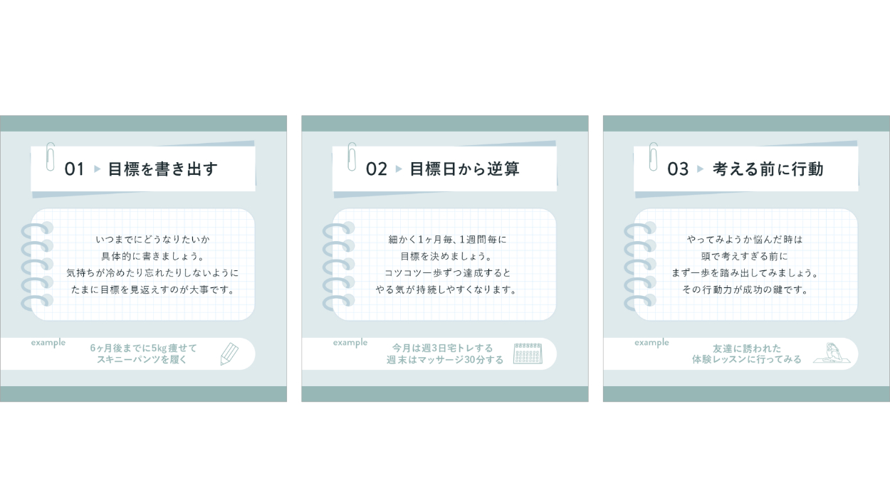 目標を叶える手帳・ノート術を最近よくInstagram で見かけるので、手帳やノートを意識して文房具中心のデザインにしました。