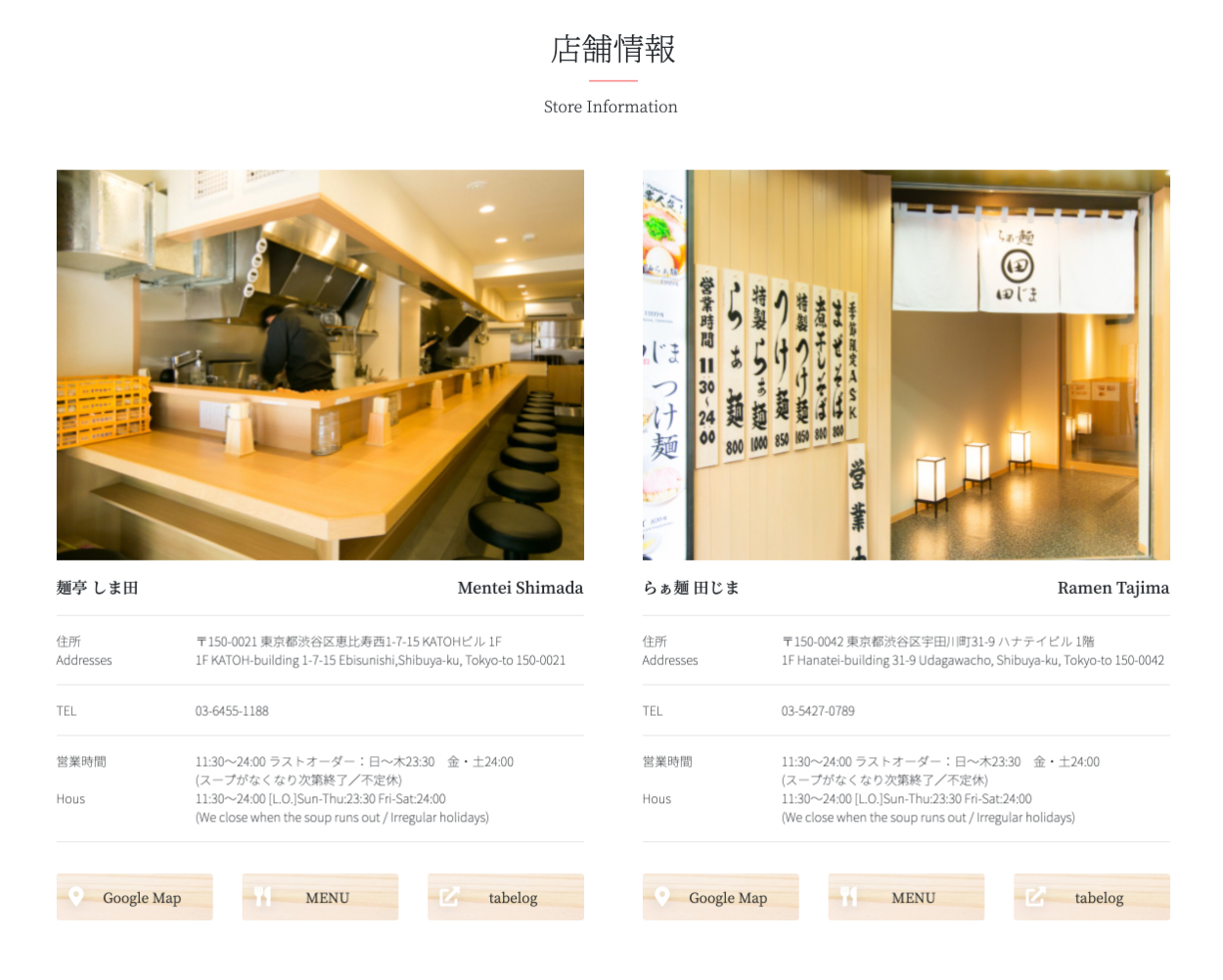 「麺亭しま田」「らぁ麺田じま」サイト店舗情報部分