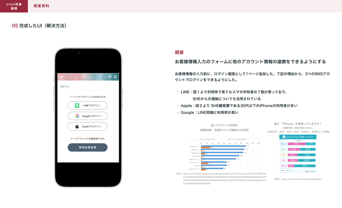フォームでの離脱率が大きい点について、SNSアカウントを利用できるように設定した理由として、なぜその提案に至ったかを数値的評価のあるグラフを載せることで利便性を説明でき、確度が上がるような工夫をしました。
