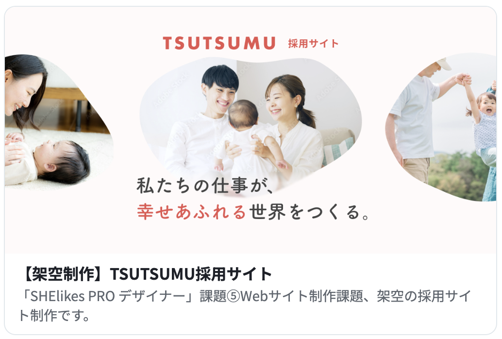 「SHElikes PRO デザイナー」にて、採用サイトのデザイン制作・実装課題に取り組みました。架空クライアントからの要件書をもとにストーリー案、ワイヤフレーム、デザイン制作、コーディング実装、サーバーアップまで一通りを行いました。