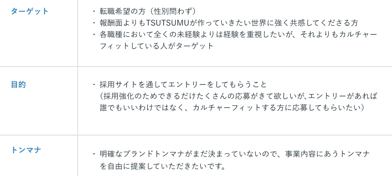 与えられたターゲットと採用目的から、以下の分析と情報設計を行いました。