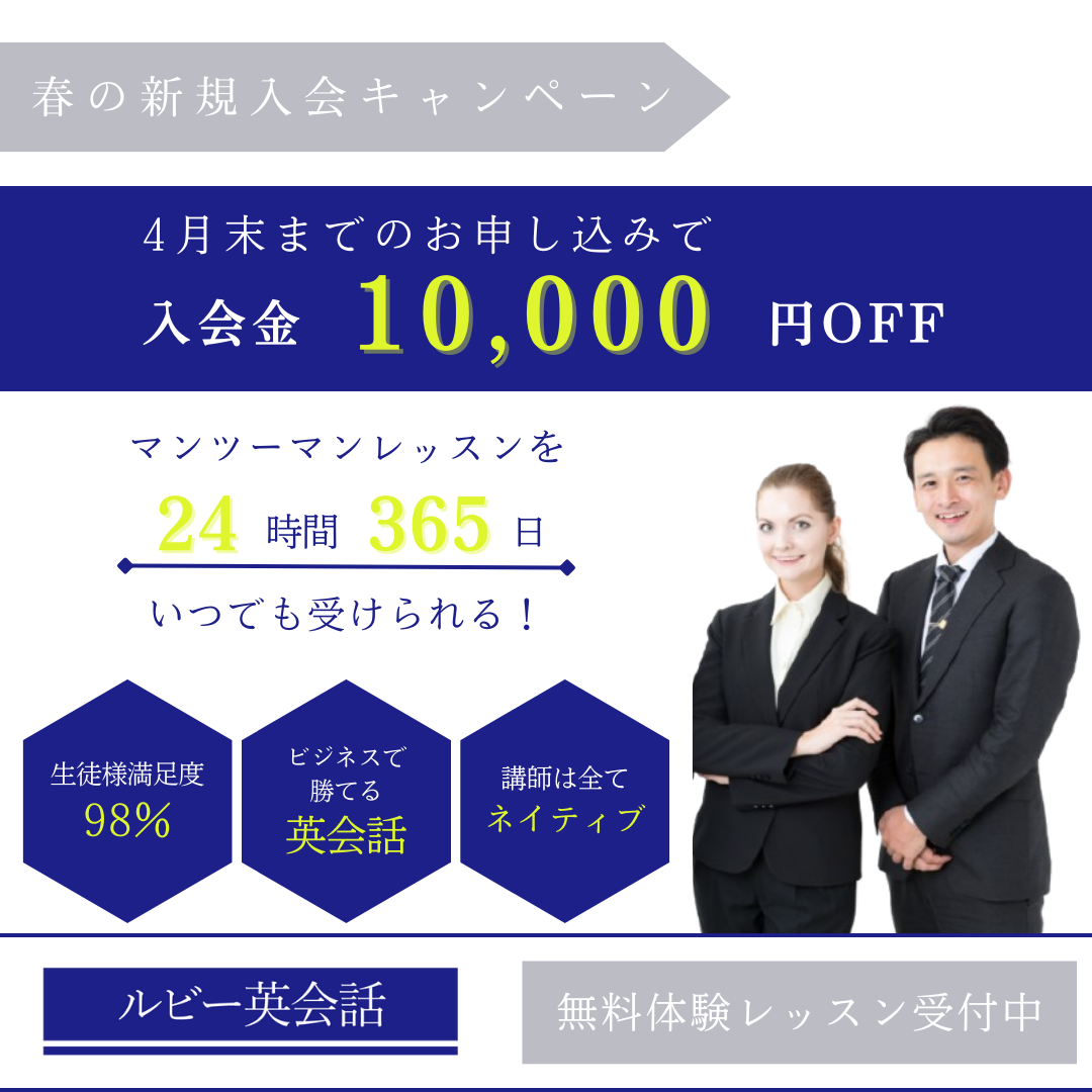 当スクールは「ビジネスシーンで使える英語力をつける」をモットーに、ある程度の英会話レベルをお持ちの方向けの英会話スクールとなります。 忙しい社会人の方でも利用しやすい様に、マンツーマンレッスンを24時間365日いつでも受講していただけるのが特徴です。 主な受講生様は20代〜40代の方が多く、どちらかというと男性の生徒様に多く利用いただいております。 利用料金:月額15,000円(税込)※25分×8回/月 キャンペーン時以外は入学金10,000円がかかります。