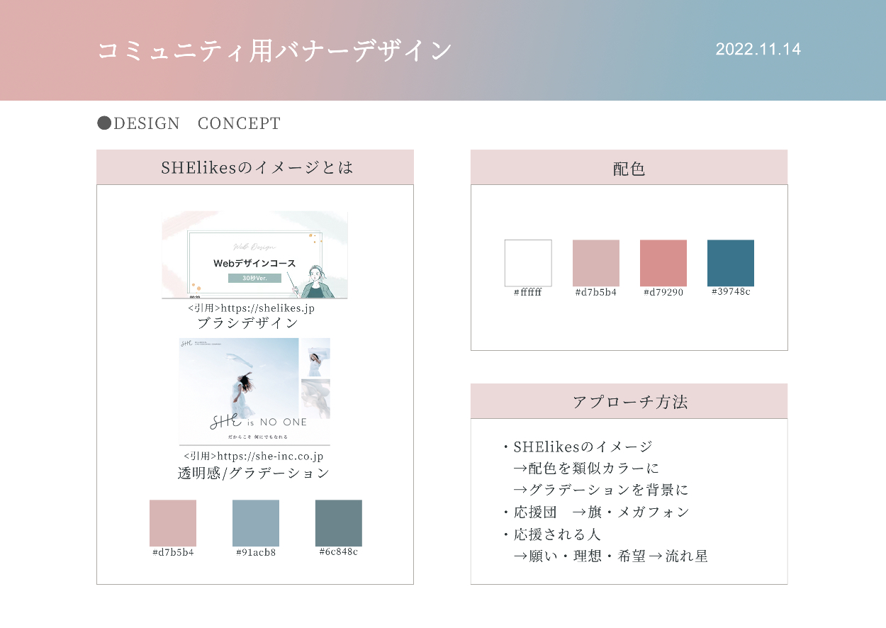・キャリアスクールSHElikes利用者の自主企画コミュニティで使用するということで、パッと見てイメージがリンクするようにした。