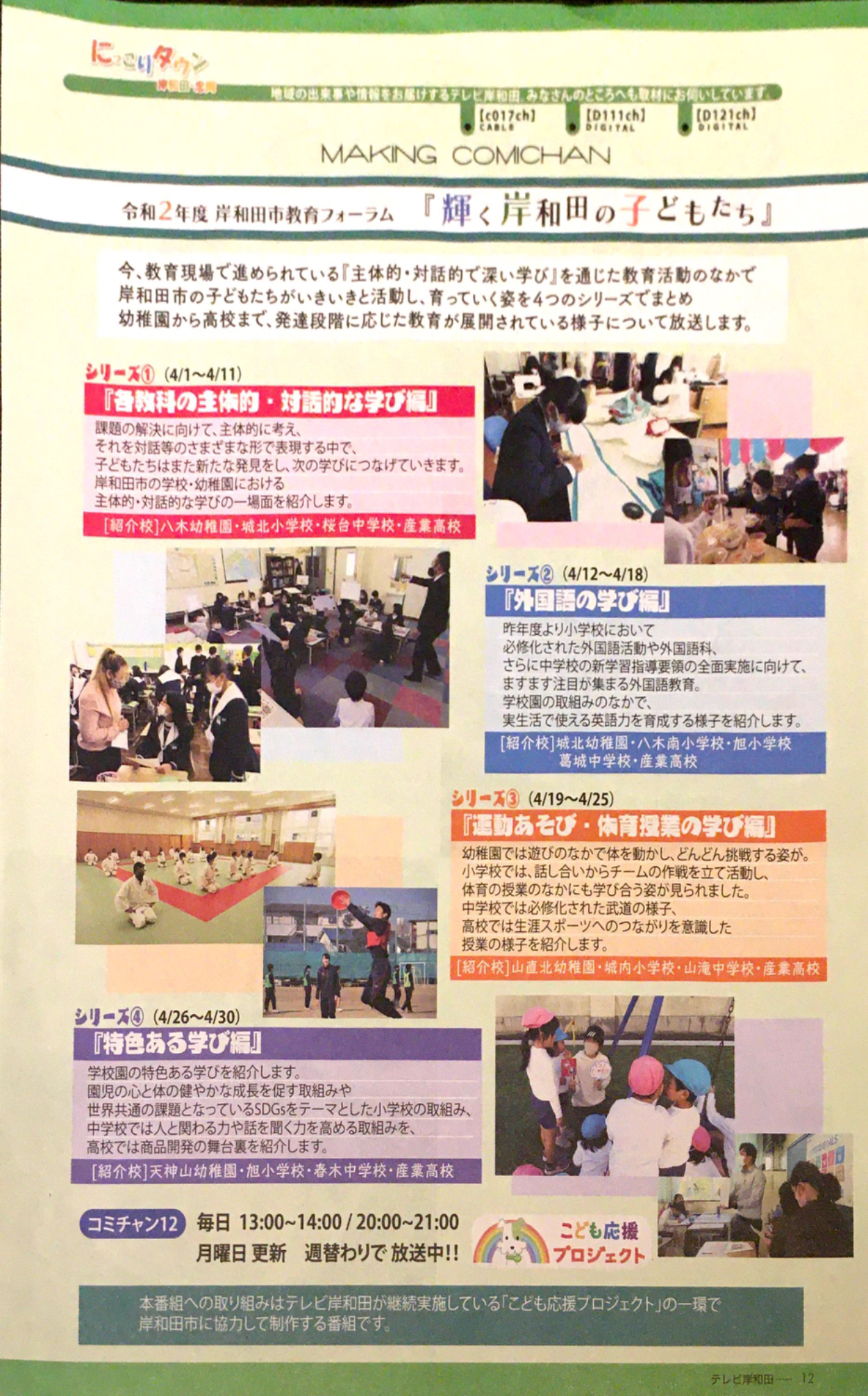 岸和田市の教育委員会からの依頼で、岸和田市の教育現場の特色と子どもたちの成長過程を番組化。新型コロナウイルスにより小学校などの臨時休業期間中には、市立の小中学校の先生方にスタジオをお貸しし、家庭での学習を支援するため「きしわだ学びチャンネル」を放送・配信しました。それが好評で全国ニュースにもなったことから、第二弾として当番組を企画。