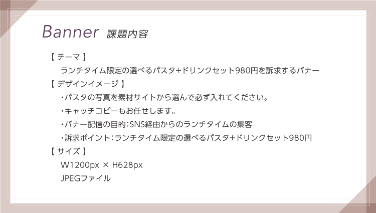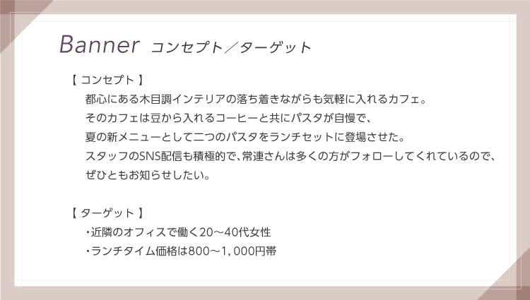 デザインスクールの課題で作成しました。おいしそうなパスタと色味で興味がそそられ、「どんなお店かな?」と思わずクリックしたくなるバナーを目指しました。