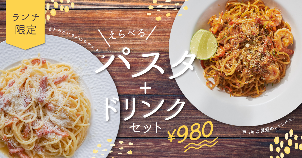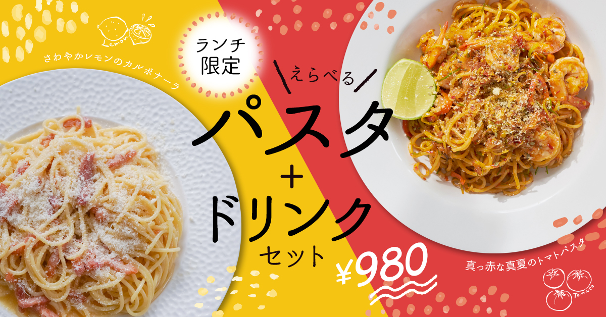パスタが2つから選べるので「レモンカルボナーラの黄」「トマトパスタの赤」を強調し、より楽しげでカジュアルな雰囲気を伝わりやすくしました。