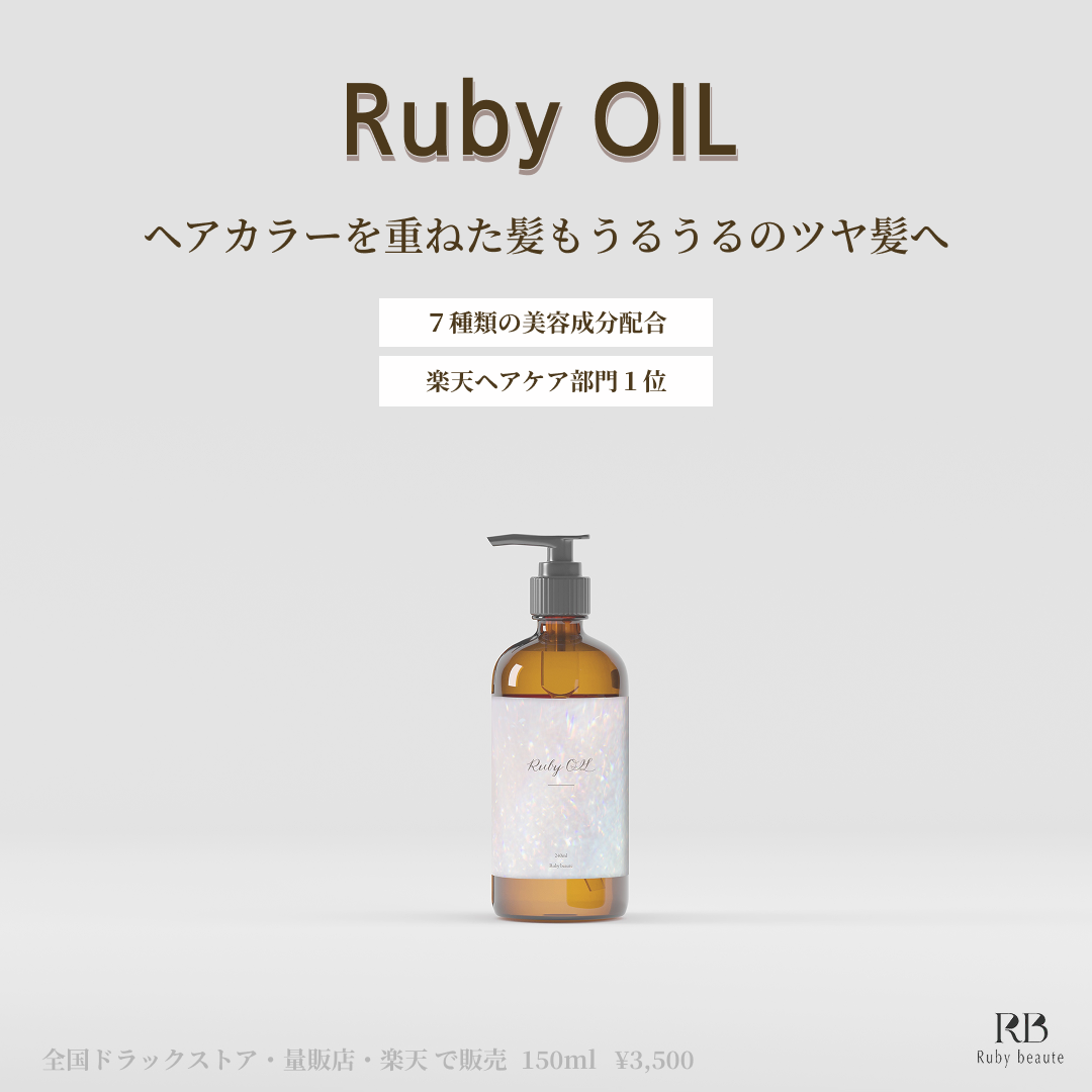 RubyOILはヘアカラーを楽しむ方のお悩みに寄り添ったヘアオイルとして開発されました。ヘアカラーで傷んだ髪のパサつきを、潤いのある滑らかなツヤ髪へ導きます。保湿美容成分を7種類配合しており、傷みケアはもちろん、カラーの色持ちも良くしてくれます。普段の生活やリラックスタイムにも気にならない無香料。