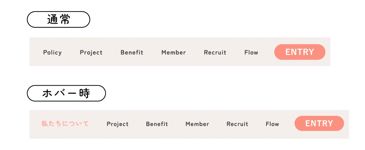 - ヘッダー部分は通常時は英語表記ですが、ホバー時に日本語表記に変わるようにデザインしました。