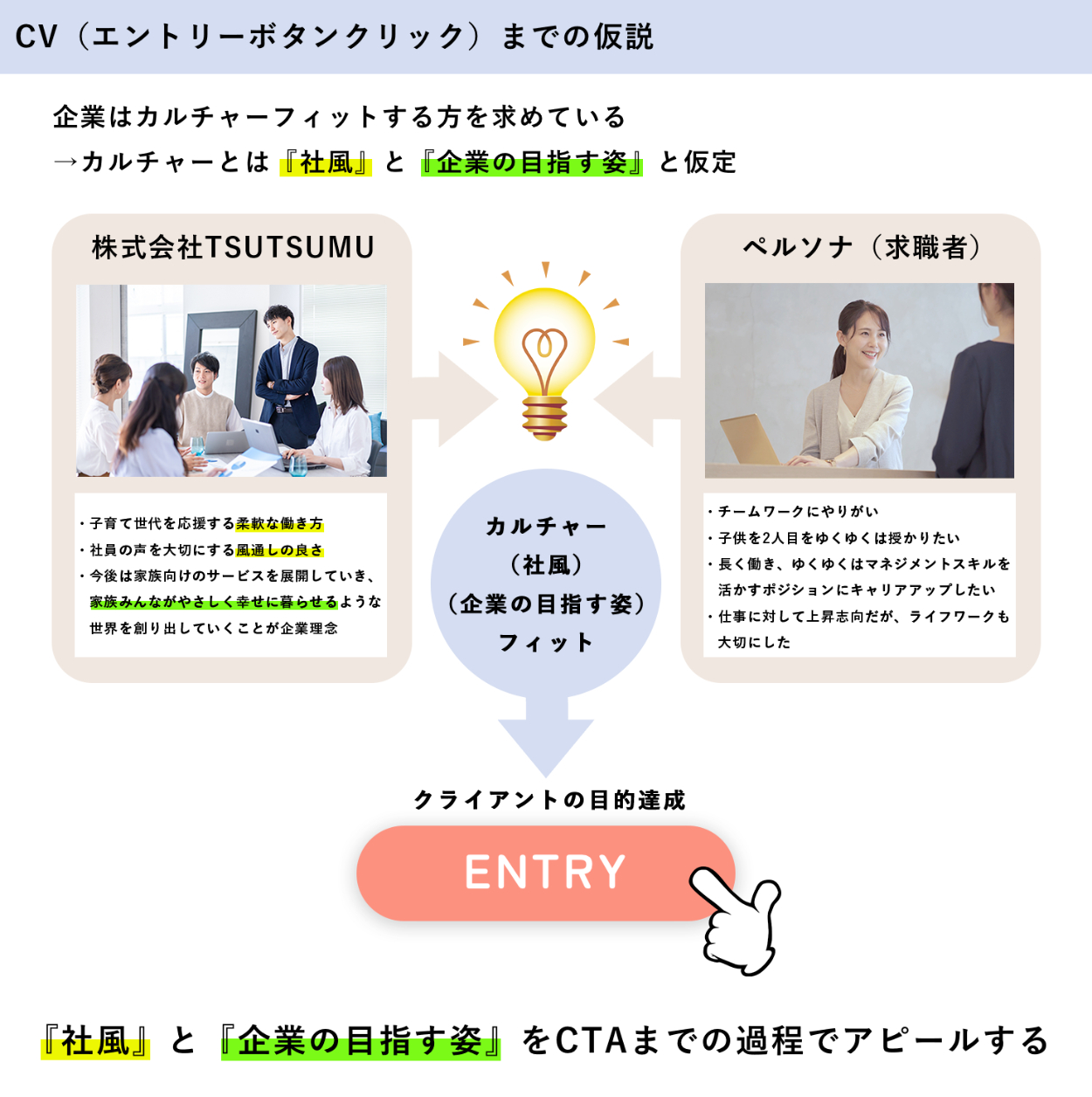 エントリーされやすい採用サイトとは、企業の雰囲気が採用者に伝わり働くイメージが想像でき、マッチングに繋がる採用サイトと仮定しました。クライアントの要件書を元に、ペルソナとカルチャーフィットの定義を独自で考えました。