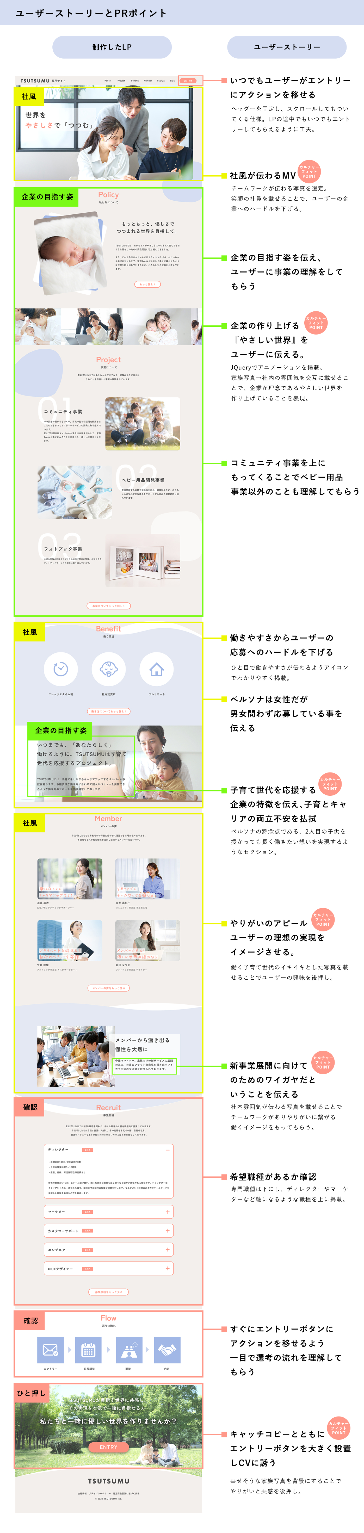 - クライアントの目的(エントリーしてもらうこと)を達成するためのユーザーストーリーをデザインに落とし込むために、セクションの順番や社風が伝わる写真選びの重要性を学びました。