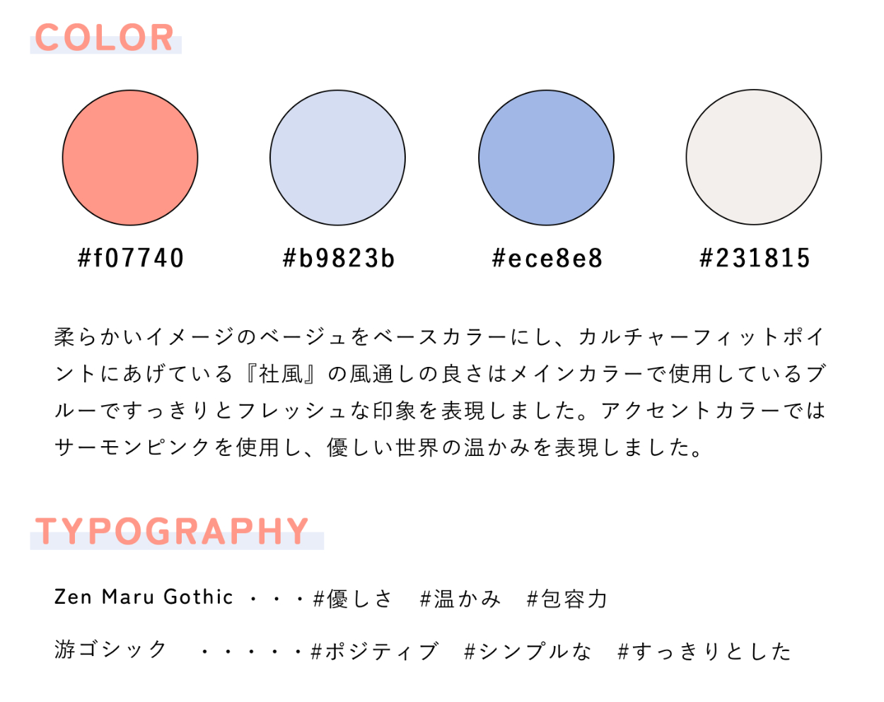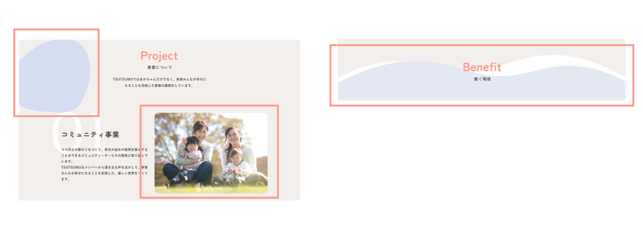 - あたたかみのある優しい雰囲気の世界観を作り出すために、丸い動くあしらいを背景につけたり、写真は全て角丸にしております。