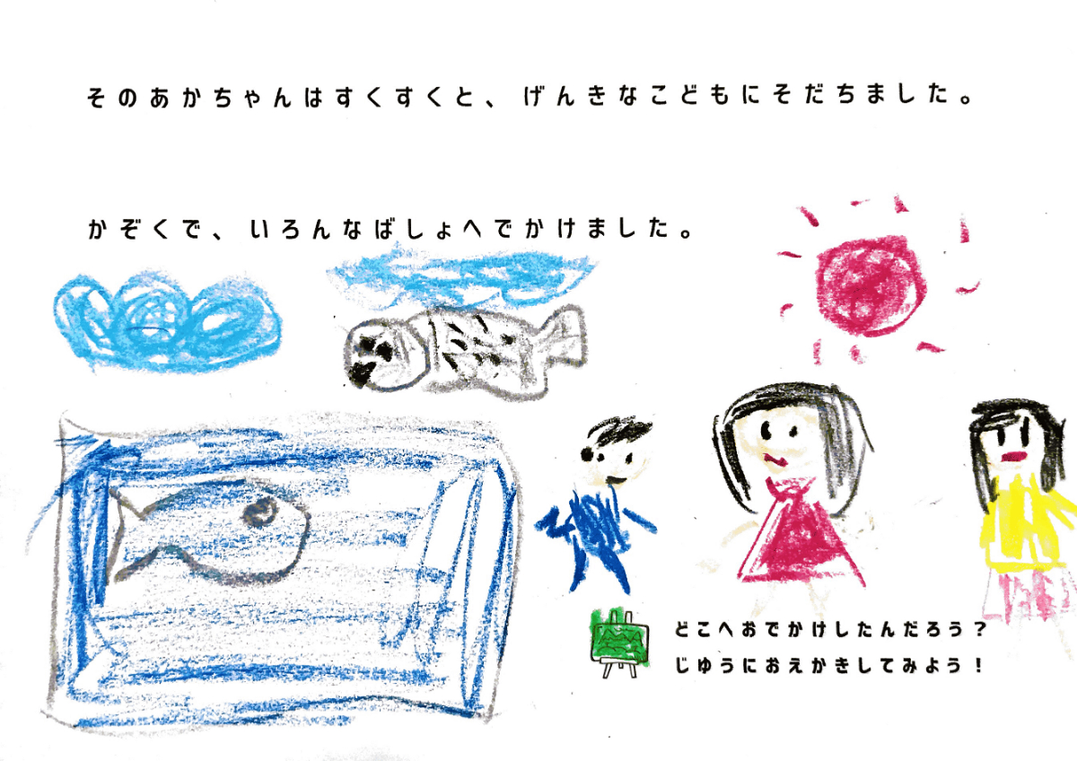 電通 Internship 2017 アイディアの学校 にて開催された「敬老の日を盛り上げるアイディアを考える」がテーマのコンペティションで 最優秀賞 をいただいた作品です。敬老の日に家族でとりくむ参加型のプロダクトを制作しました。この絵本ほとんどが空白のページでできており、祖父母との対話を通じ、家族にまつわるストーリーを子供が絵本で完成させるというプロダクトです。