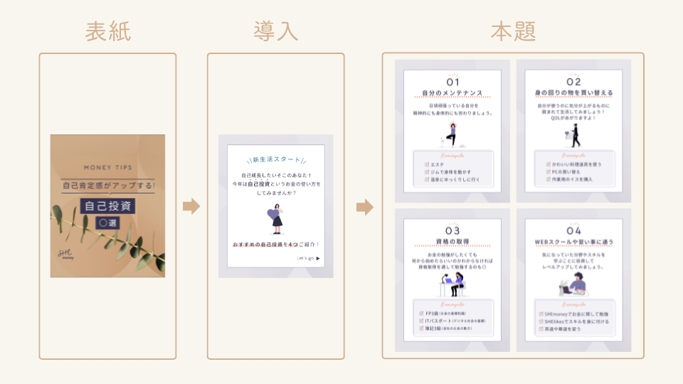 ・最初のページにて強調したい「自己投資」の部分には、上部に色の違う点を配置するのと文字の大きさ、太さを変えより目に着くように意識しました。