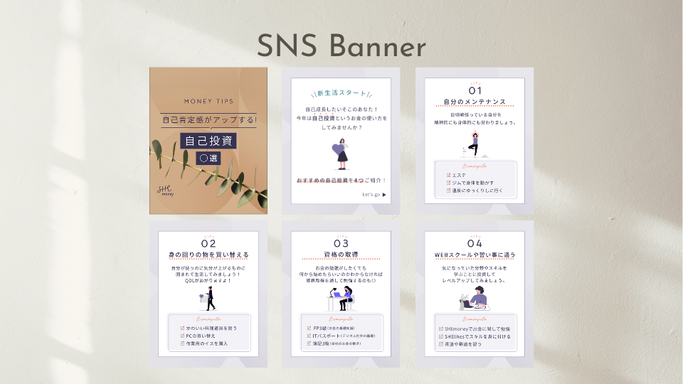 SHElikes株式会社様が運用するオンラインスクールSHEmoneyのInstagram投稿用バナーを制作し、コンペ形式で採用していただきました。【使用ツール:Photoshop 制作時間:5日】
