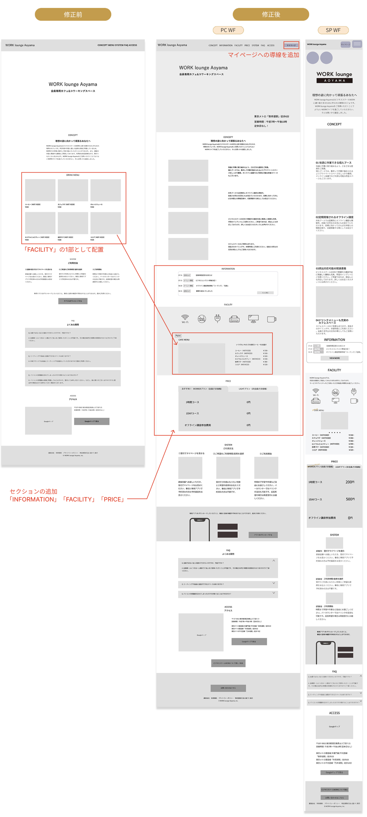 修正前の「DRINK MENU」について、ペルソナの利用目的としては優先順位が低いと判断し、「FACILITY」の1部として配置変更をしました。また、当初のセクションでは金額がわかるものがなかったので「PRICE」を追加しました。さらに、ペルソナが興味を惹く情報をLPに落とし込むため「INFORMATION」を追加しました。