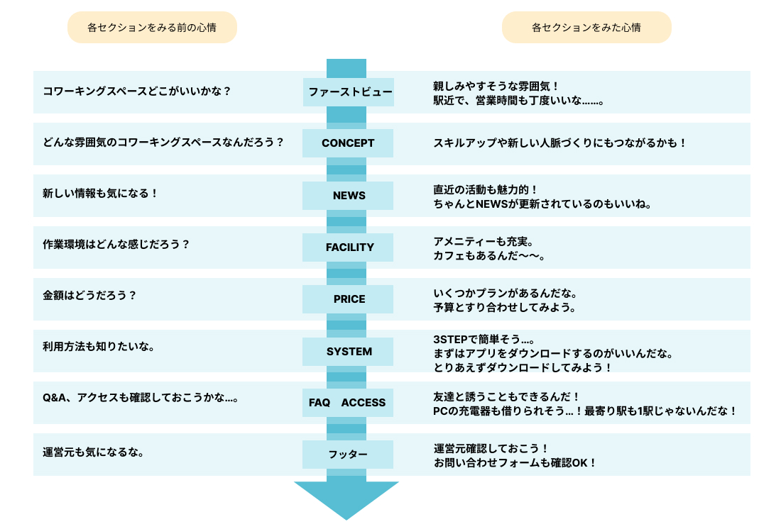 必要な人へ必要な情報が届くように、情報の取捨選択と、伝える順番について工夫しました。具体的には、LPのセクションをコワーキングスペースの「雰囲気を伝える」「設備について説明する」さらに興味をもったユーザーに対して「追加情報を詳しく伝える」という順番で並べ、整理しました。