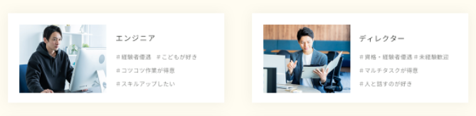 募集職種:5つの職種をカード化し、ハッシュタグで向いている素質を整理して配置しました。
