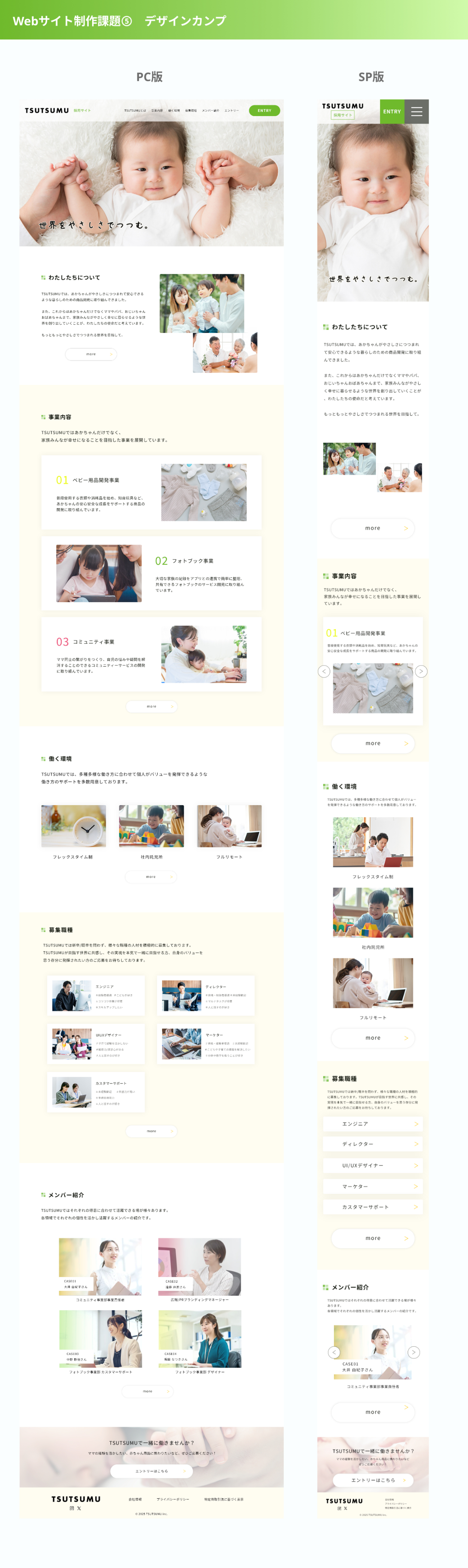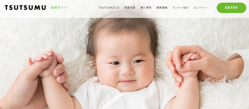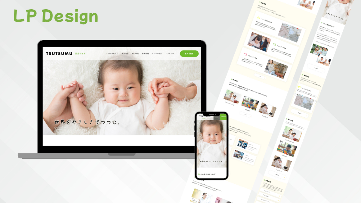 SHElikes PROデザイナーでの実践課題です。 ベビー事業を運営する会社を題材にした『TSUTSUMU』の採用サイトを制作しました。