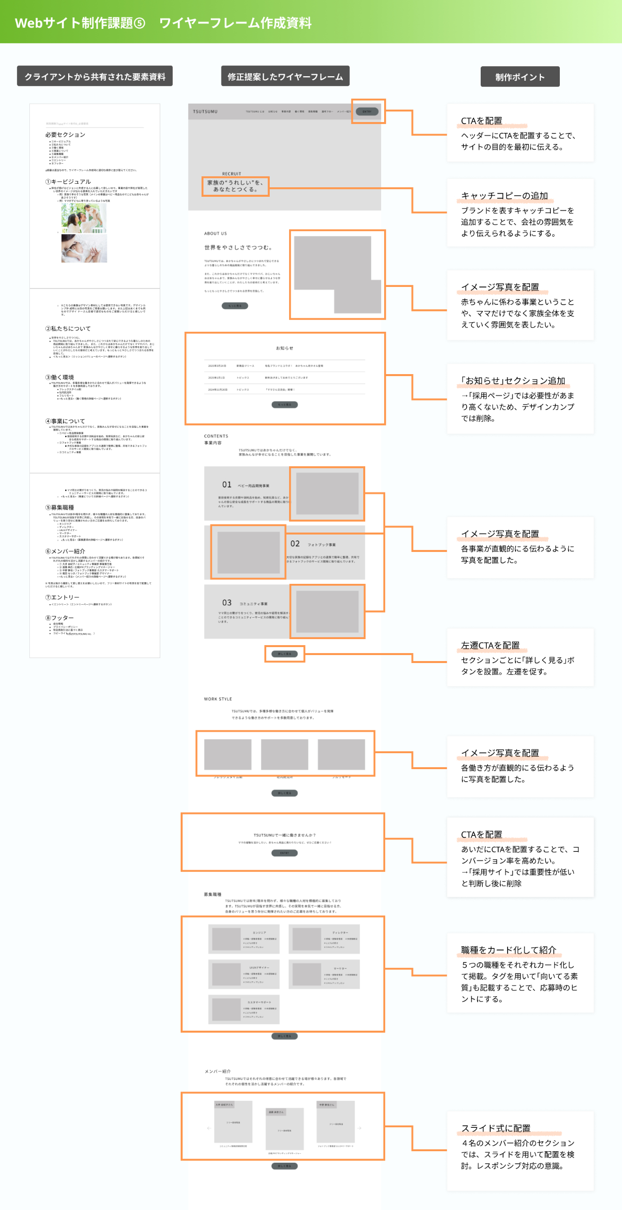 ・今回は要件定義設定からペルソナ分析も自身で行い、ワイヤーフレームも0から作成しました。最初の要件定義をしっかり行った上で情報設計に落とし込むことで、「採用サイトとしてエントリーに繋げる」という芯を持って制作することができたと感じています。要件定義の重要性を実感した課題でした。