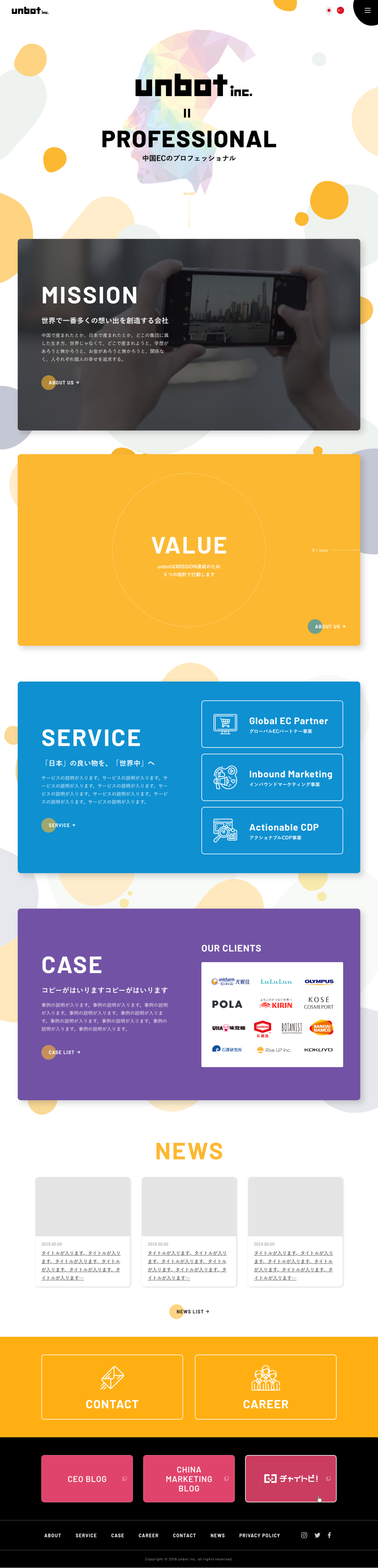 上海のwebマーケティング会社であるunbotさんのキャラクター(エネルギッシュさや、活気、人間味あふれる社風、先進感や成長性)をダイナミックに表現。内部では、実装側と、アイデアを実現するためにどうすればいいかをとことん話あったプロジェクト。