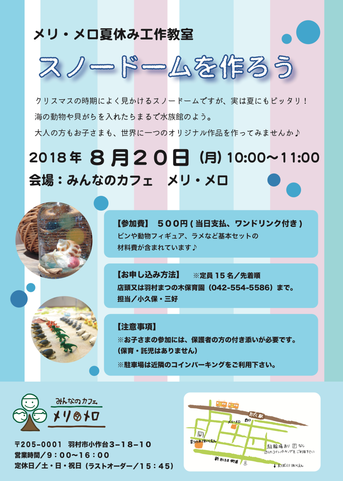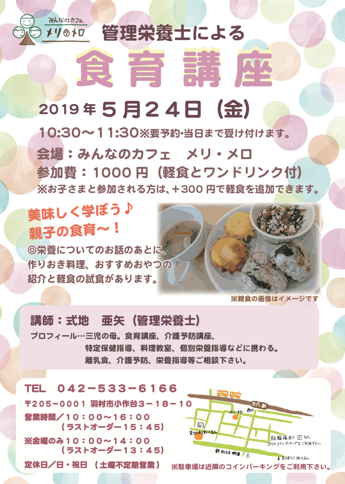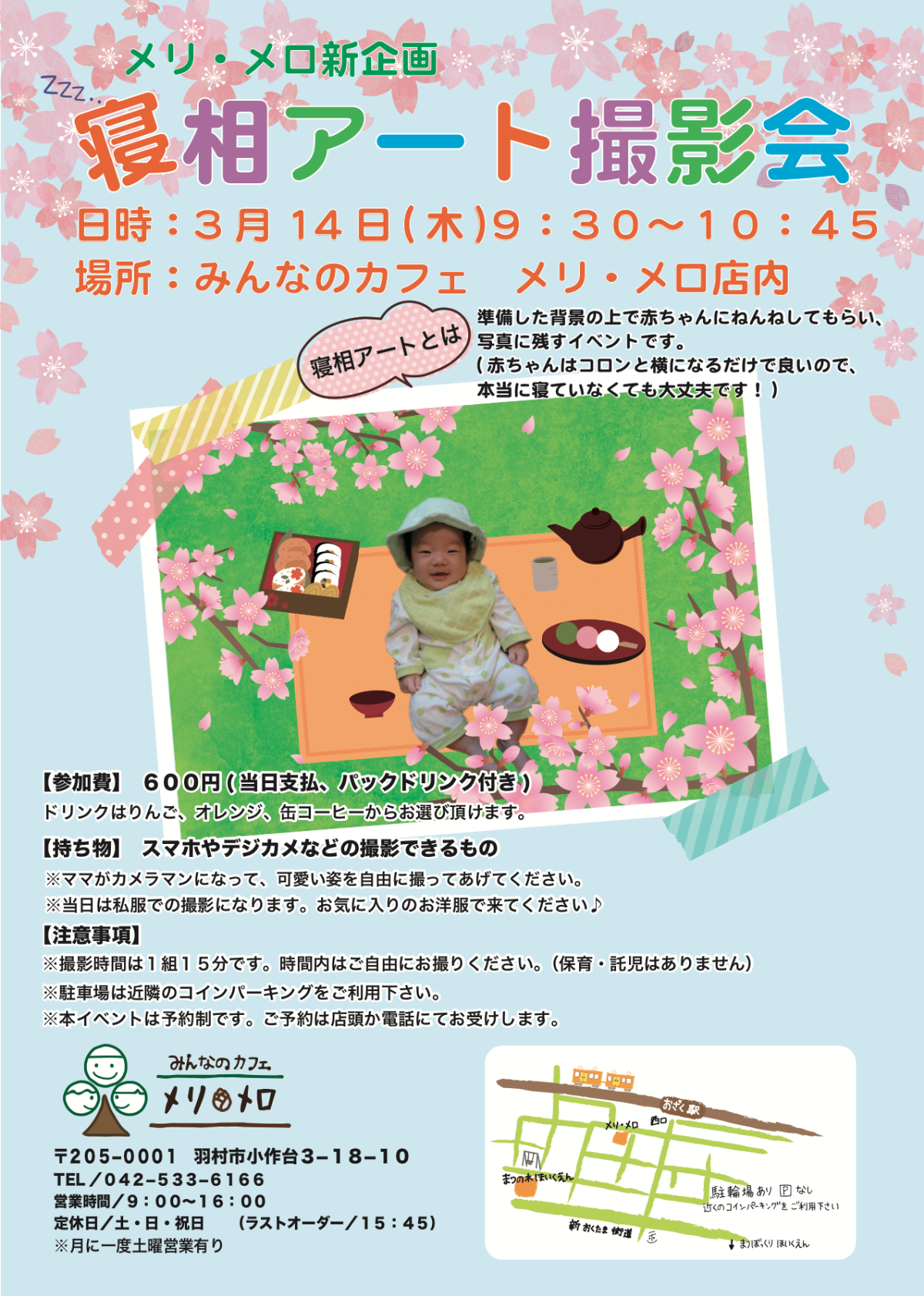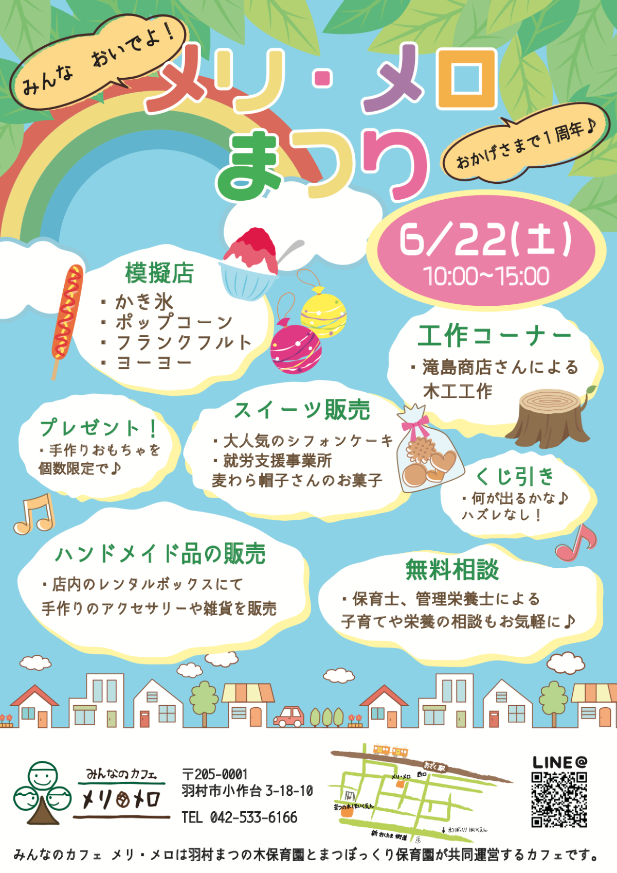 チラシ【みんなのカフェ メリ・メロ】 彩り屋@地域密着Canva×インスタ多摩 デザイナー/Canva講師/Instagram運用代行 OVERVIEW 保育園が母体となって運営している、地域密着型カフェ。 店舗自体のPRチラシだけでなく、店内で開催されるイベントやメニューに関するチラシも作っています。 また、イベントのカレンダーは毎月発行しています。