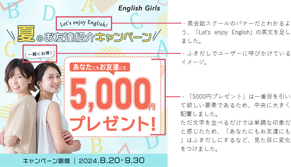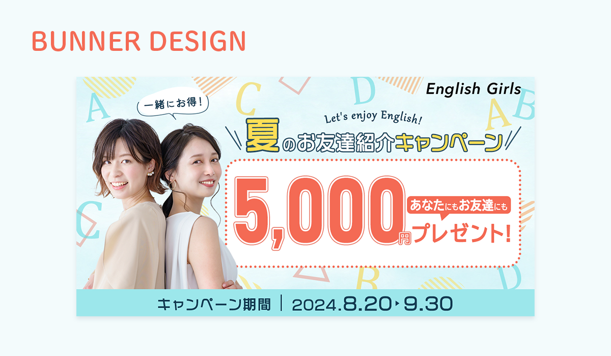 SHElikes PROデザイナーの課題にて、英会話スクールを題材にした『English girls』のキャンペーンバナーを制作しました 。