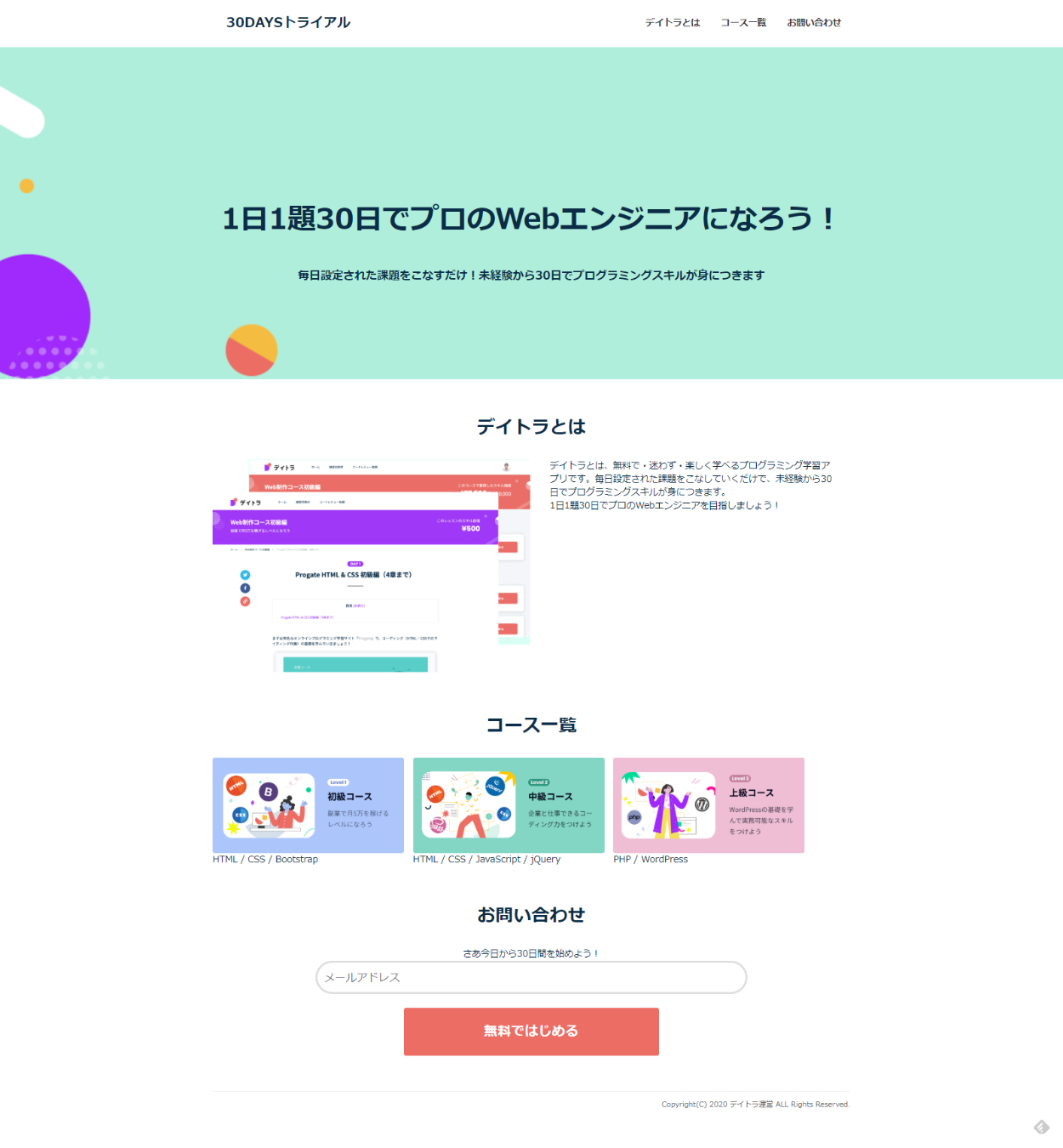 30DAYSトライアル トップページコーディング 二木 寿崇 グラフィックデザイナー・WEBデザイナー OVERVIEW 無料公開されている「 30DAYSトライアル 」のトップページのコーディング。 YEAR 2020 PC / SP 両デバイスに対応した、レスポンシブデザインでコーディングしました。