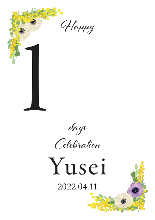 - 生後100日がちょうど春のタイミングであることや、北欧風の雰囲気のある友人宅に合うミモザのイラストをいれました。