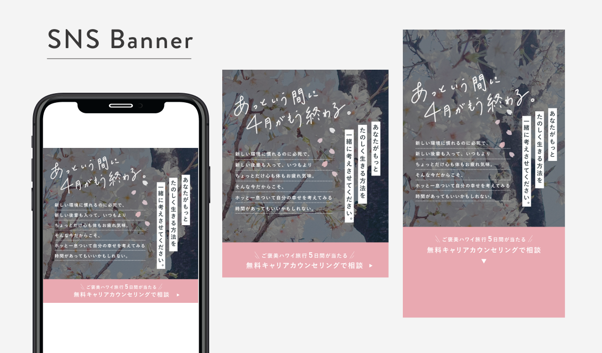 - 背景には新年度をイメージする春の桜の写真を使用し、視認性UPの為写真の上に暗めの色を敷いています。