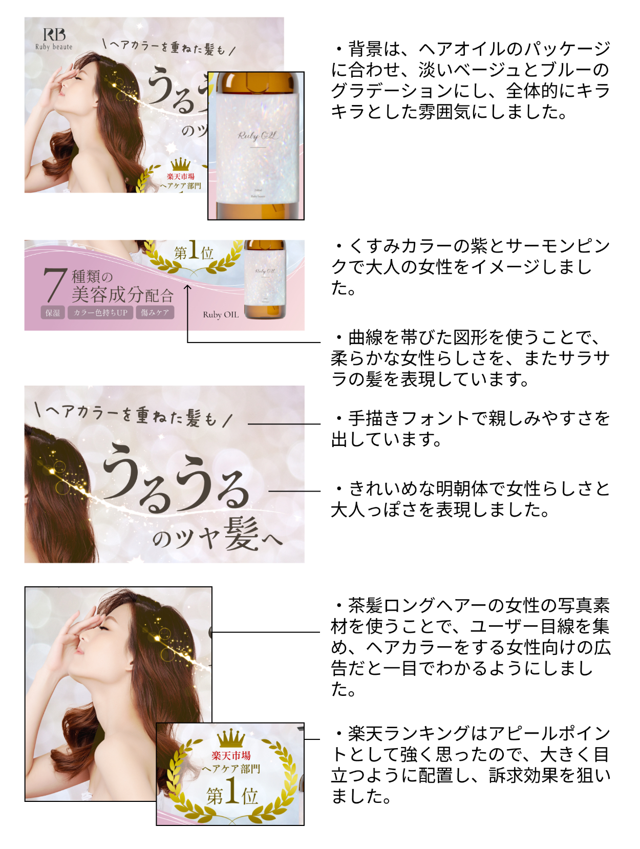 新作ヘアオイルの商品LP誘導を目的としたSNS広告バナー制作