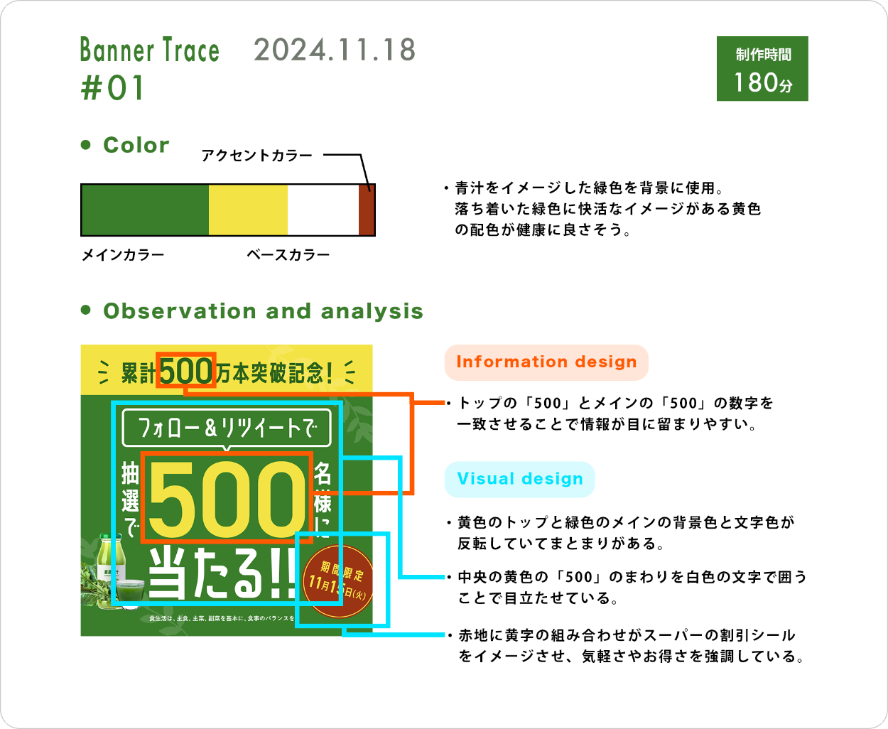 デザインスクールのバナートレース課題に取り組みました。見本バナーをトレースし、「ターゲット」「目的」「配色」など分析結果をまとめています。