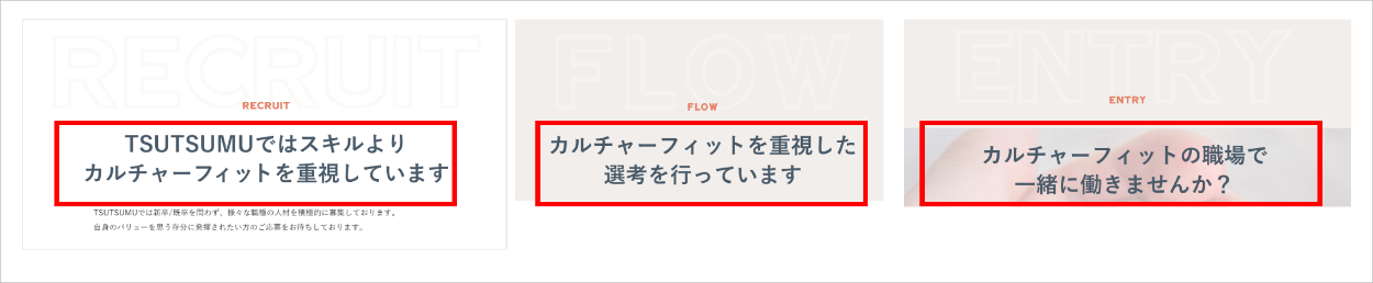 特にセクション後半の職種、選考の流れ、エントリーの各セクションの見出しに “ カルチャーフィット ” という言葉を繰り返し使用し、カルチャーフィットの重要度が高いことをアピールしました。